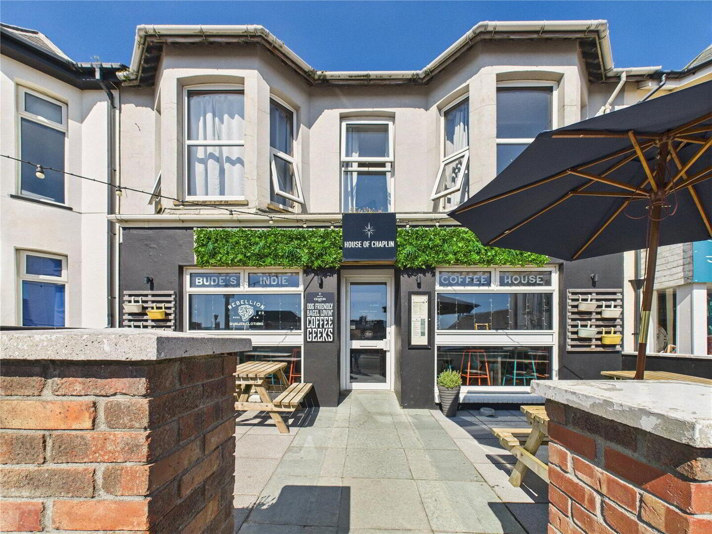 The ground floor is home to a popular and well-established café/retail business, trading from a generous open-plan shop space with kitchen, office, storage, and WC facilities. The unit benefits from excellent street visibility and forms part of a vibrant pedestrianised area in the heart of Bude.