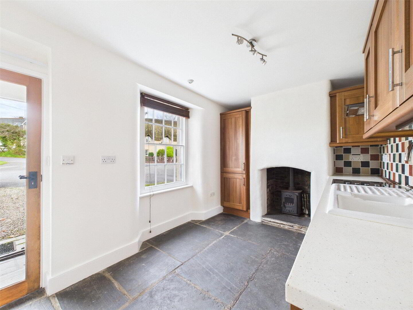 The superbly presented accommodation includes a well-appointed kitchen positioned at the front of the property, featuring an attractive range of wall and base units, a ceramic one-and-a-half bowl sink, built-in oven with hob and extractor, and an integrated dishwasher. A sash window provides a lovely outlook over the village centre, while a feature fireplace with a wood-burning stove creates a warm and welcoming focal point.