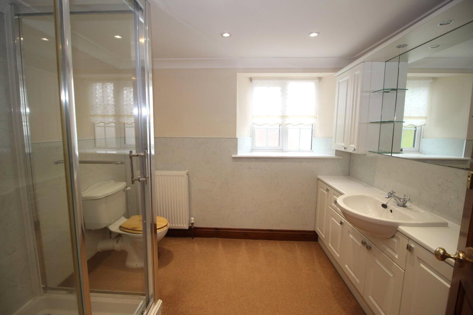 - Carpet, low level WC. Large shower cubical with mixer shower. Large vanity sink unit with wall and base cupboards. Large mirror. Shaver point. Radiator. Heated towel rail.