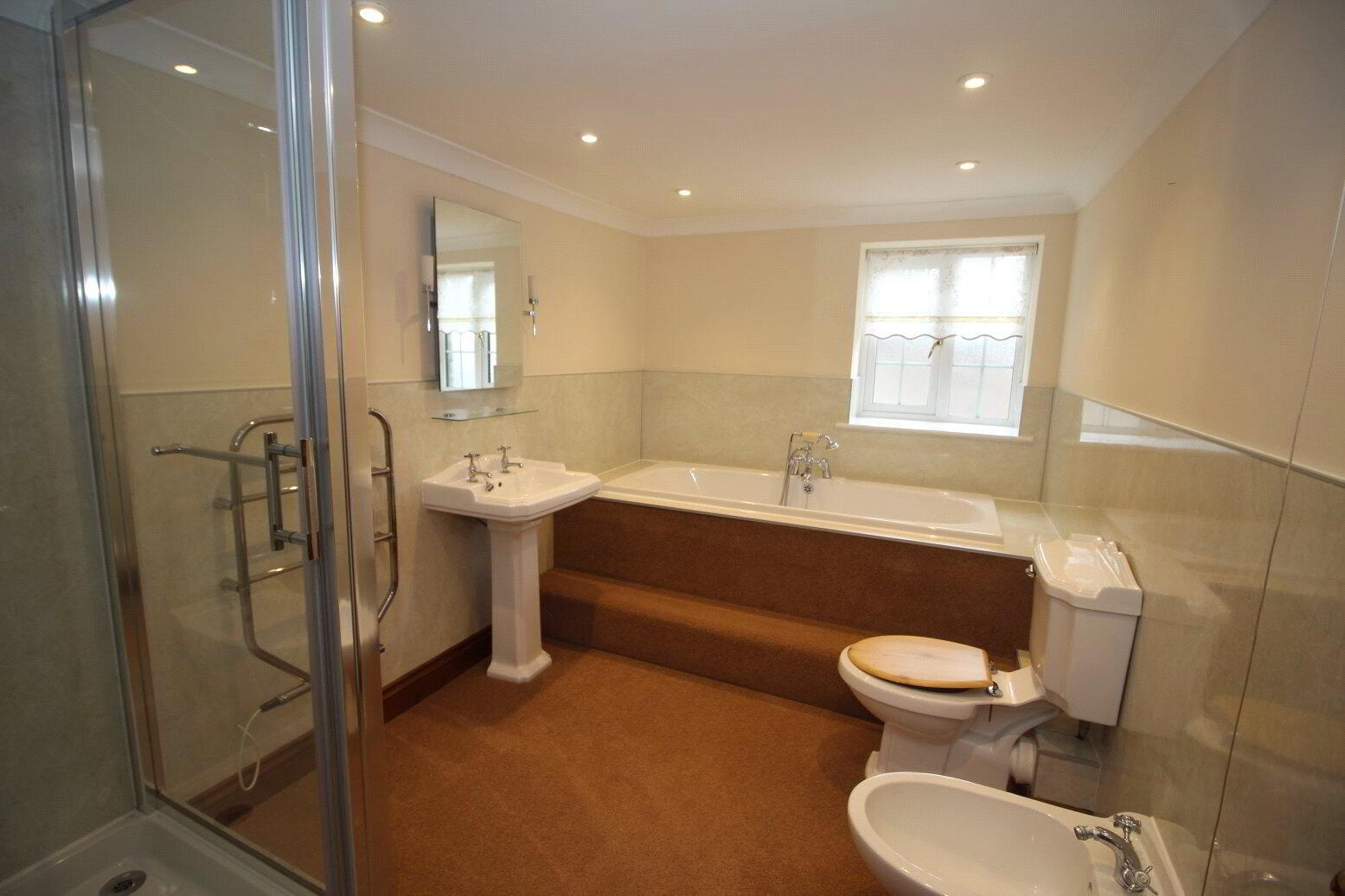 Carpet, large shower cubical with mixer shower. Step up bath, low level WC. Bidet, pedestal sink with mirror over. Heated towel rail. Radiator. - Outside