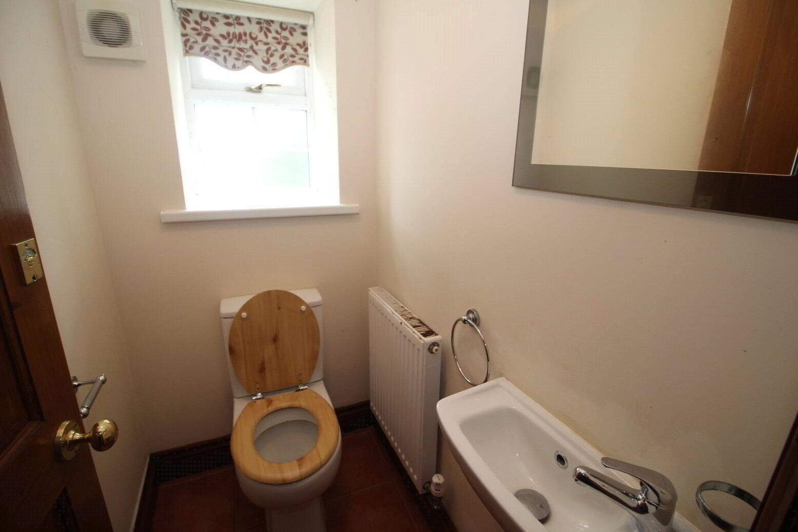 Low level WC. Wall sink with mirror over. Tiled floor. Radiator. Extractor fan. - First Floor Landing
