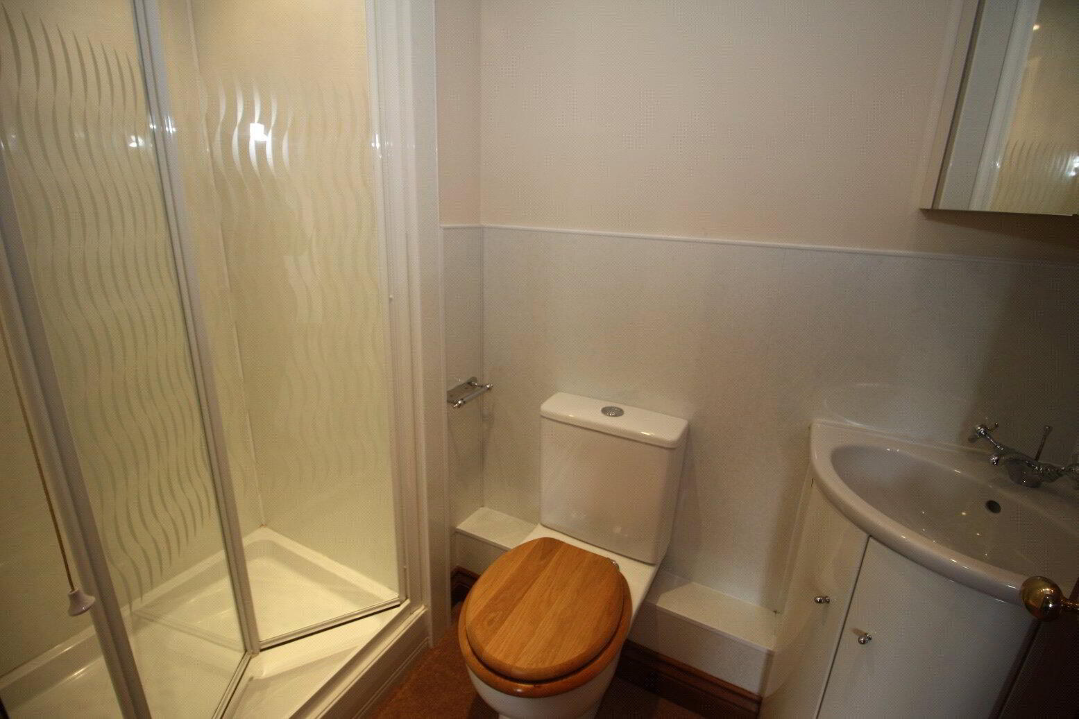 - Carpet, shower cubical with mixer shower. Aquabord splash back. Low level WC. Vanity sink unit with mirrored cabinet over. Extractor fan. Heated towel rail.