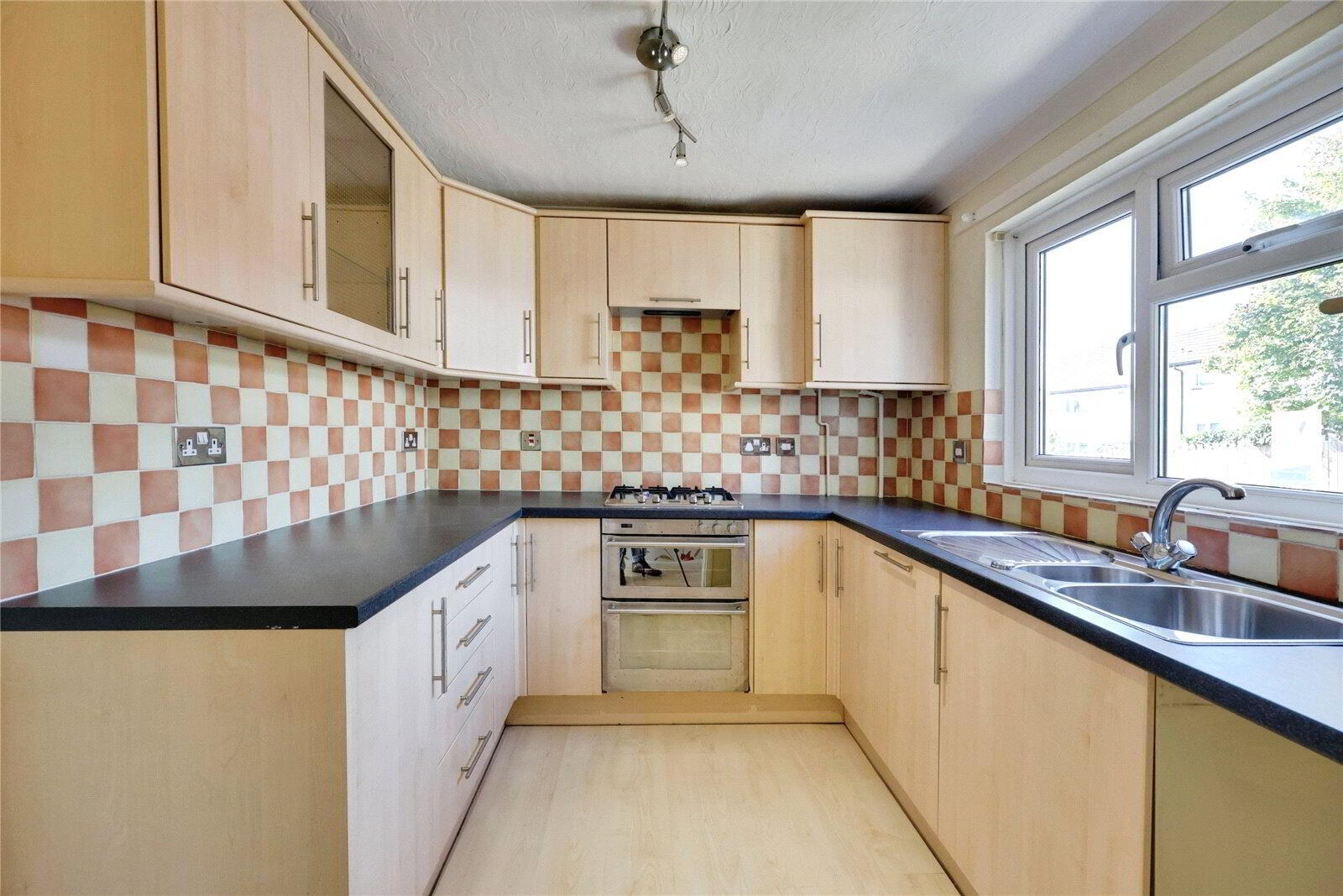 An Entrance Hall welcomes you into the home with stairs rising to the first floor and a door leading into the bright, dual aspect Living / Dining Room. This spacious reception room features French doors opening directly onto the rear garden filling the room with natural light, alongside a charming feature fireplace that adds character to the space. There is also a U-shaped Kitchen positioned on the ground floor, fitted with a built-in gas hob and oven, ample storage units and a pleasant outlook over the front garden.