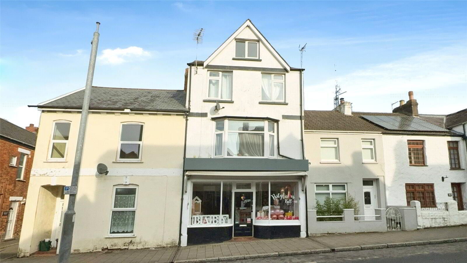 This 4-storey mixed Commercial and Residential building, including an Attic Room, is constructed under a pitched slate roof and benefits from a single-storey rear extension. The extension provides additional storage for the retail unit and a separate entrance for the residential flats.