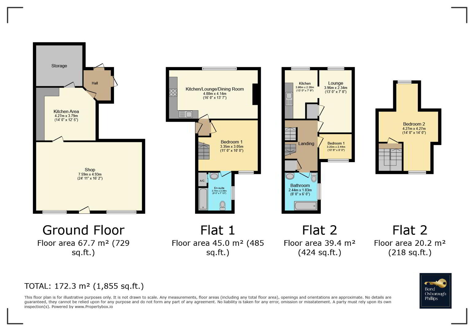 Flat 1 (First Floor): A 1 Bedroom property with a Lounge/Diner, Kitchen, Bedroom, and Shower Room.