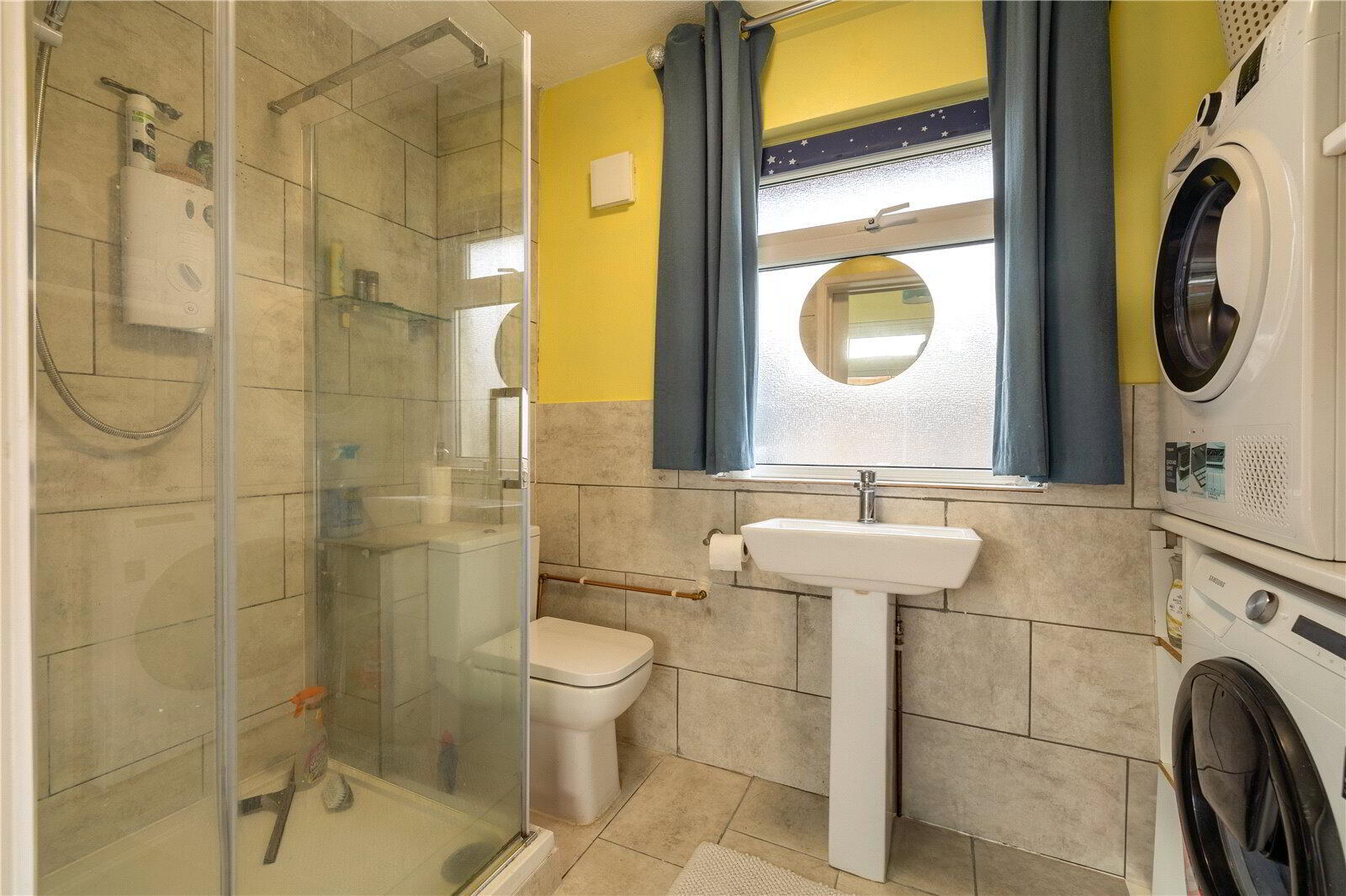 - A useful room with fitted shelving and storage with recess and plumbing for washing machine. Pedestal wash hand basin, low level WC and shower enclosure with electric shower. Dimplex fan heater, tiled flooring. UPVC double glazed obscure window.