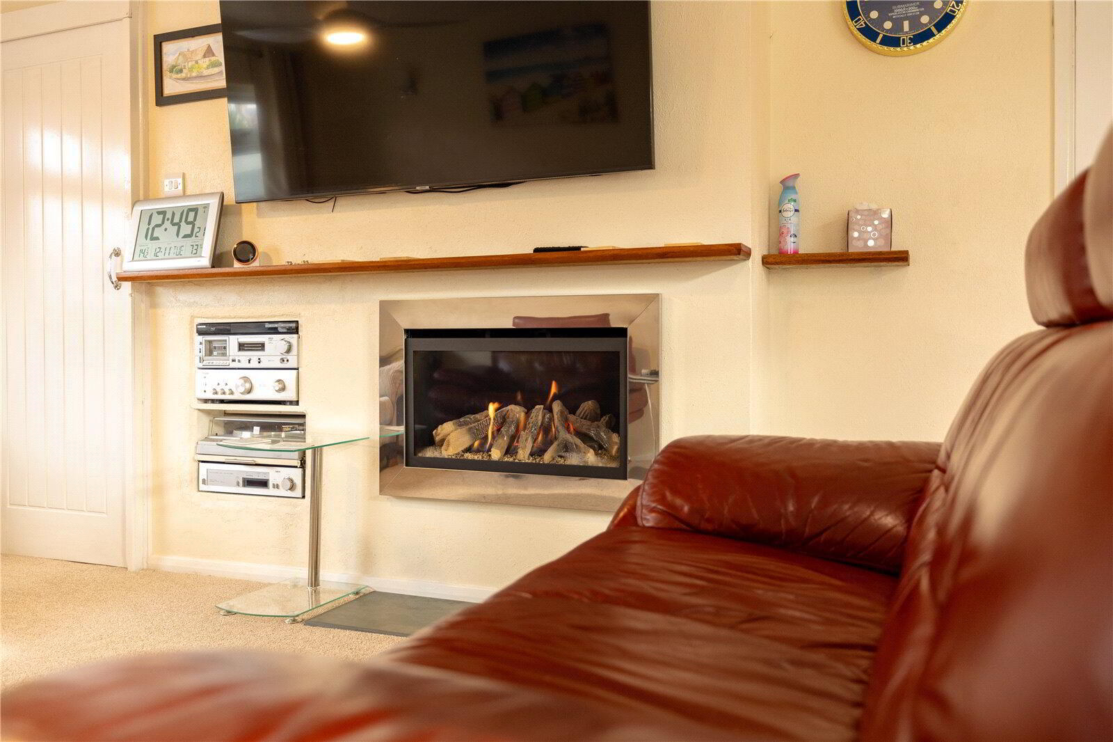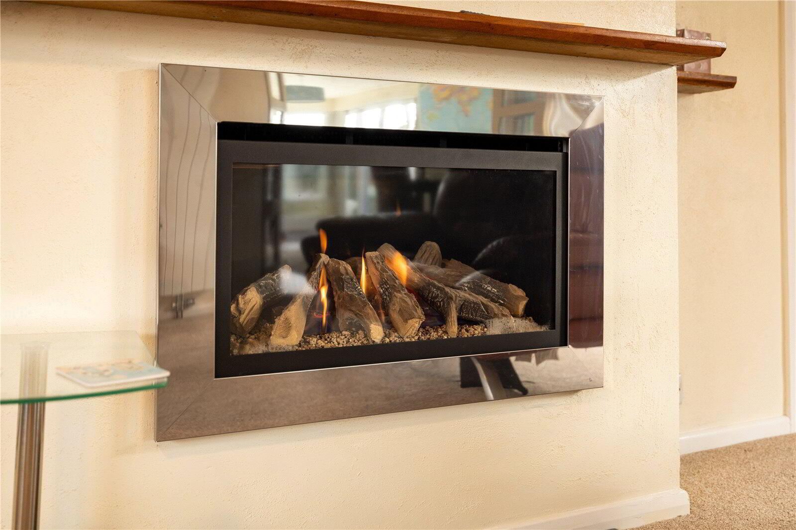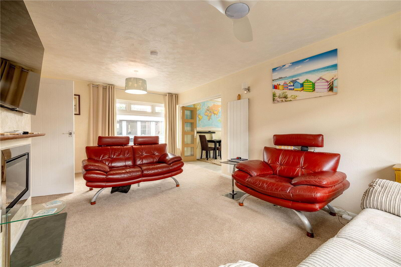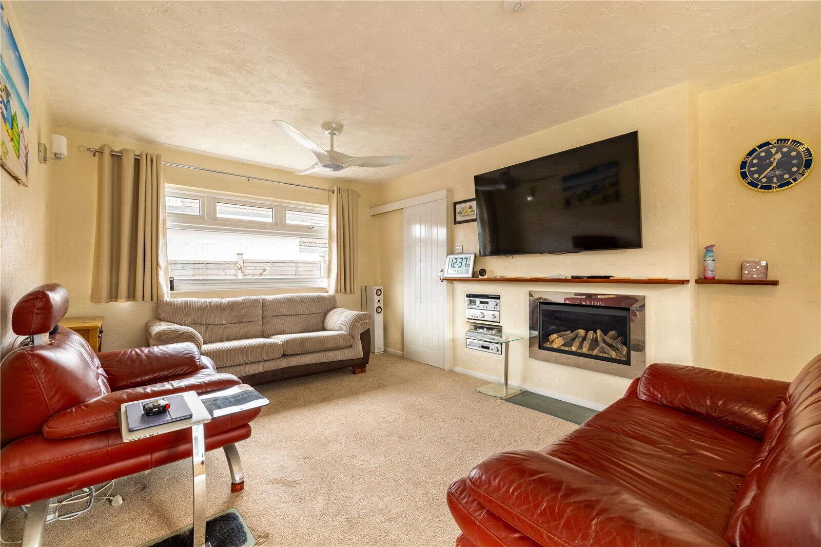 - An attractive room with UPVC double glazed dual aspect windows. Chimneybreast with feature inset log effect living flame fire (remote controlled). Vertical wall mounted radiator, ceiling fan, fitted carpet. Folding glazed doors to Kitchen / Dining Room.