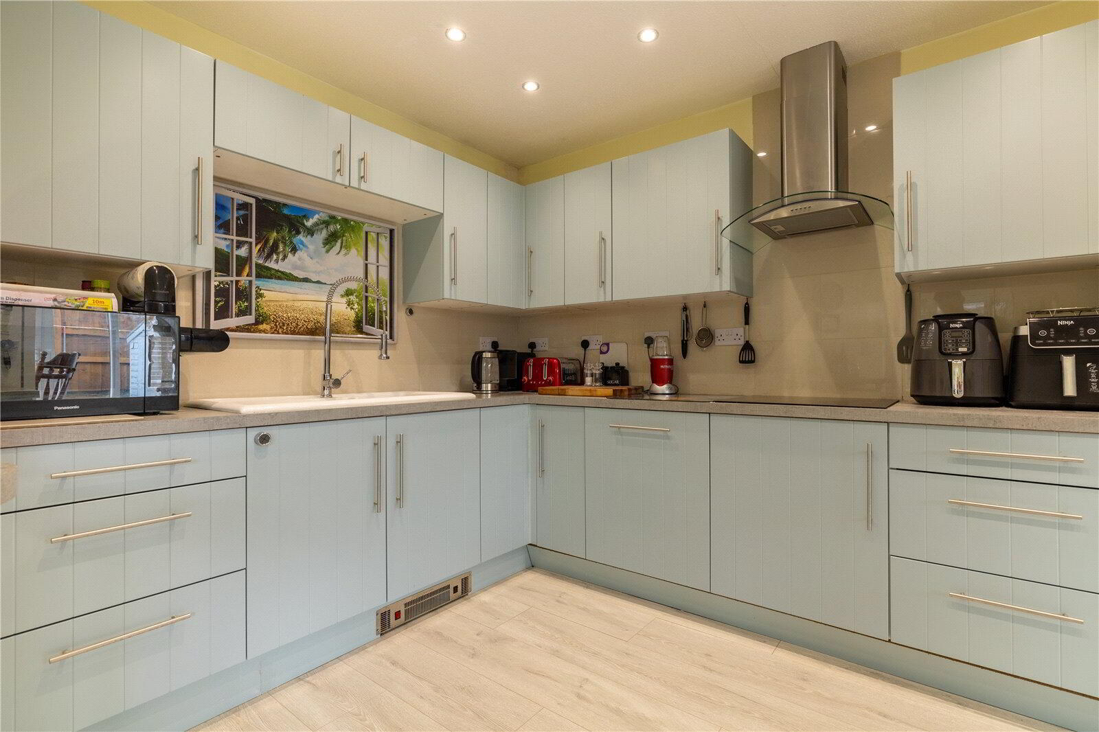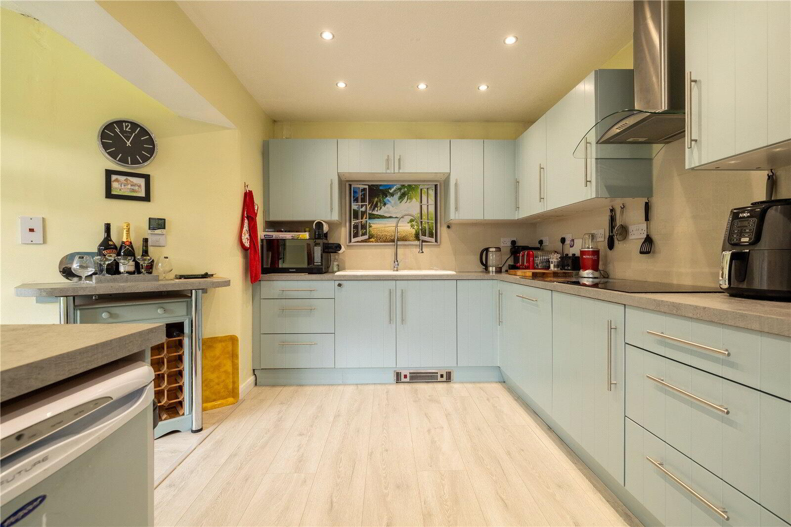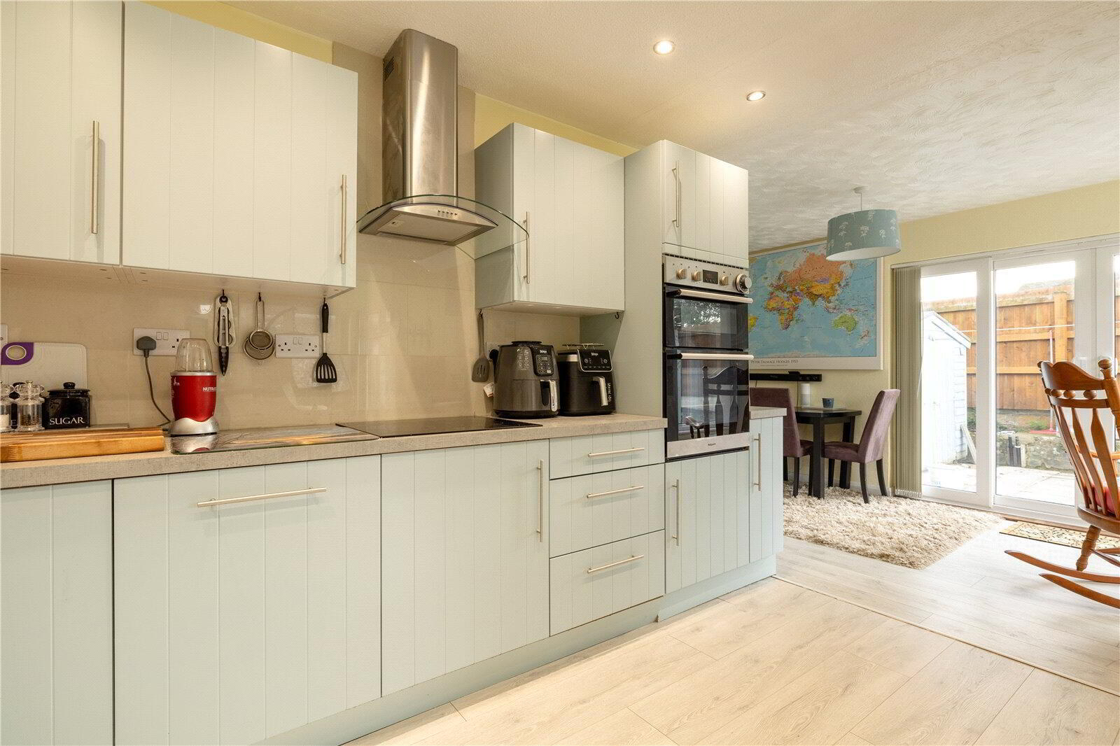 - A dual aspect room with UPVC double glazed window and UPVC double glazed sliding doors to the garden enjoying views over the front and side gardens. Fitted with an attractive modern Kitchen with work surface incorporating 1.5 bowl sink unit and 4-ring induction hob with extractor canopy over with cupboards and drawers under together with an integrated dishwasher. Built-in eye-level double oven with cupboards above and below. Extensive range of matching wall cabinets. Breakfast Bar area. Further worktop with appliance recess below. Inset LED ceiling lights, wood effect laminate flooring, radiator. Door to Study. Opening to Conservatory.