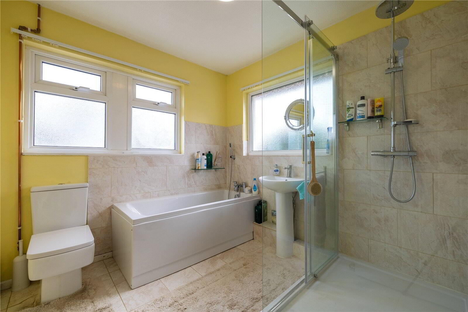 - Panelled bath with tap and shower combination fitting, pedestal wash hand basin, close couple WC and large shower enclosure with rainforest head shower and hand shower attachment. Extensive wall tiling, electric wall mounted fan heater, mirror-fronted medicine cabinet, tiled flooring. 3 UPVC obscure double glazed windows.