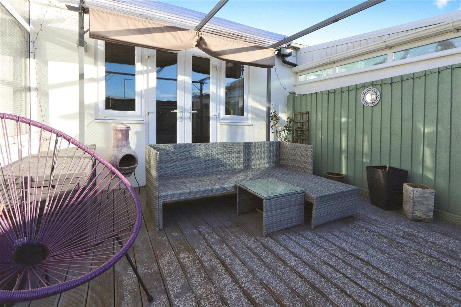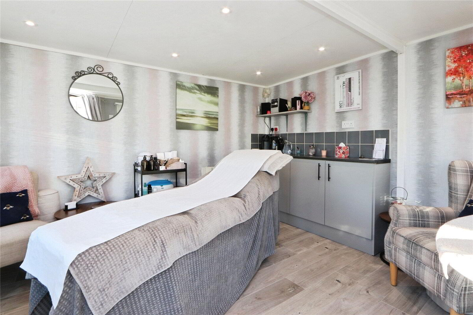 Outside, the south-facing rear garden has been thoughtfully landscaped to offer a combination of patio, decking and lawn. With power and lighting in place, it has usability throughout the year. A fully powered outbuilding is positioned within the garden and offers fantastic flexibility as a home office, salon, studio or hobby space. There is also the practical benefit of a side passage providing direct access between the garden and the front of the bungalow.