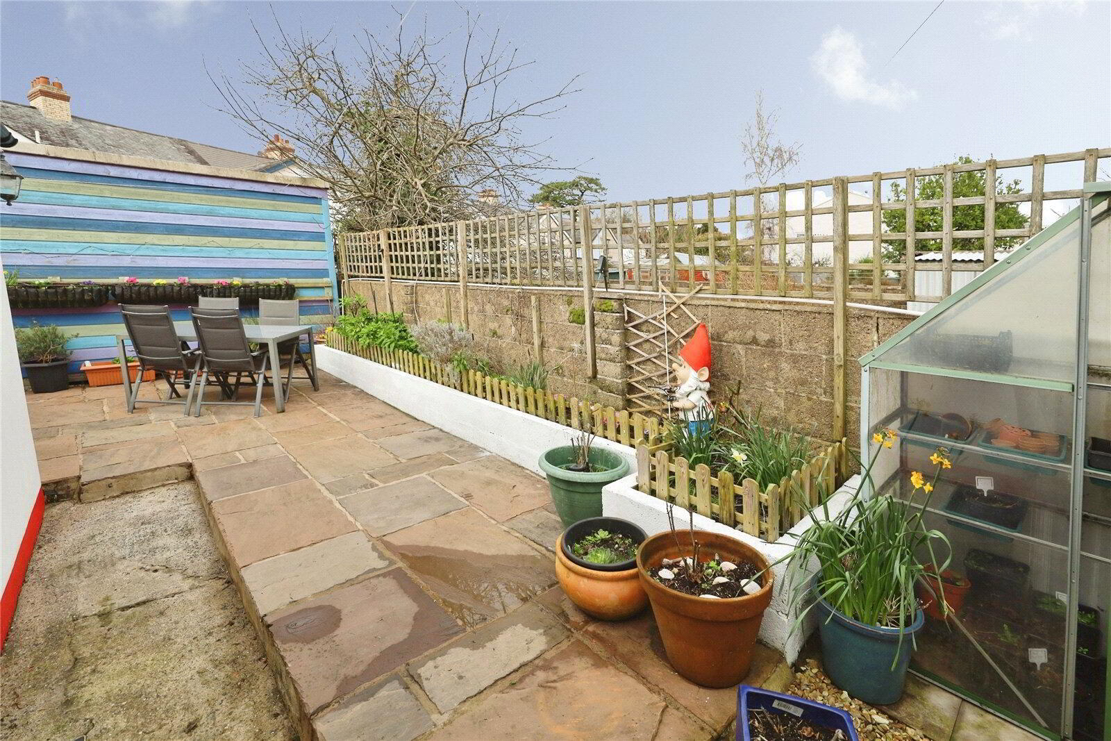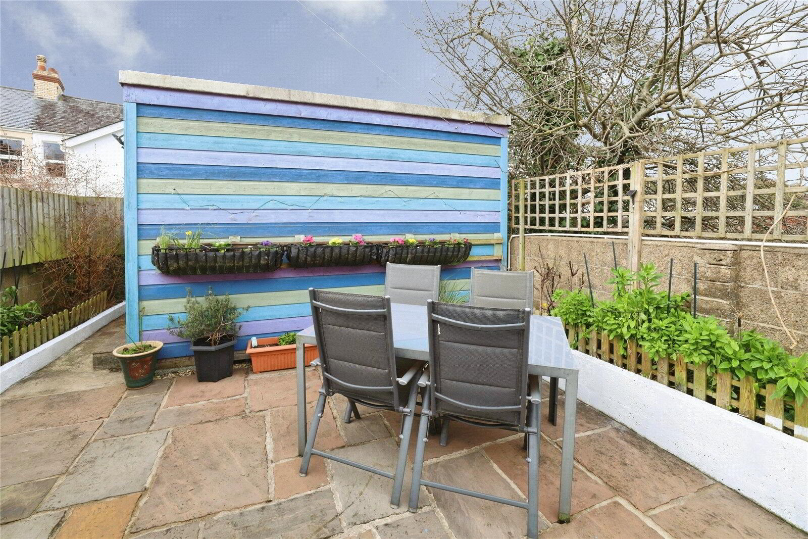 Outside, the fully enclosed rear garden is designed for ease of maintenance and enjoyment, with a storage shed positioned immediately off the dining area leading onto a level patio bordered by attractive planting. At the far end of the garden is an impressive Workshop measuring approximately 13’ x 11’ with power, light and a sink with cold water connected, offering excellent potential as a studio, gym, workspace or further home office if required. A rear gate provides convenient access.