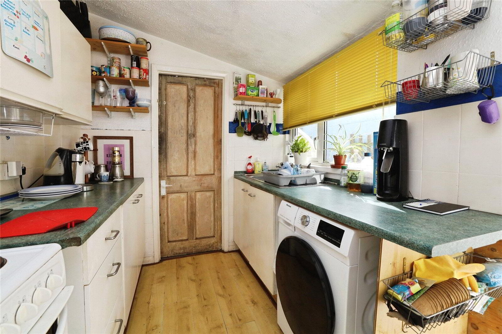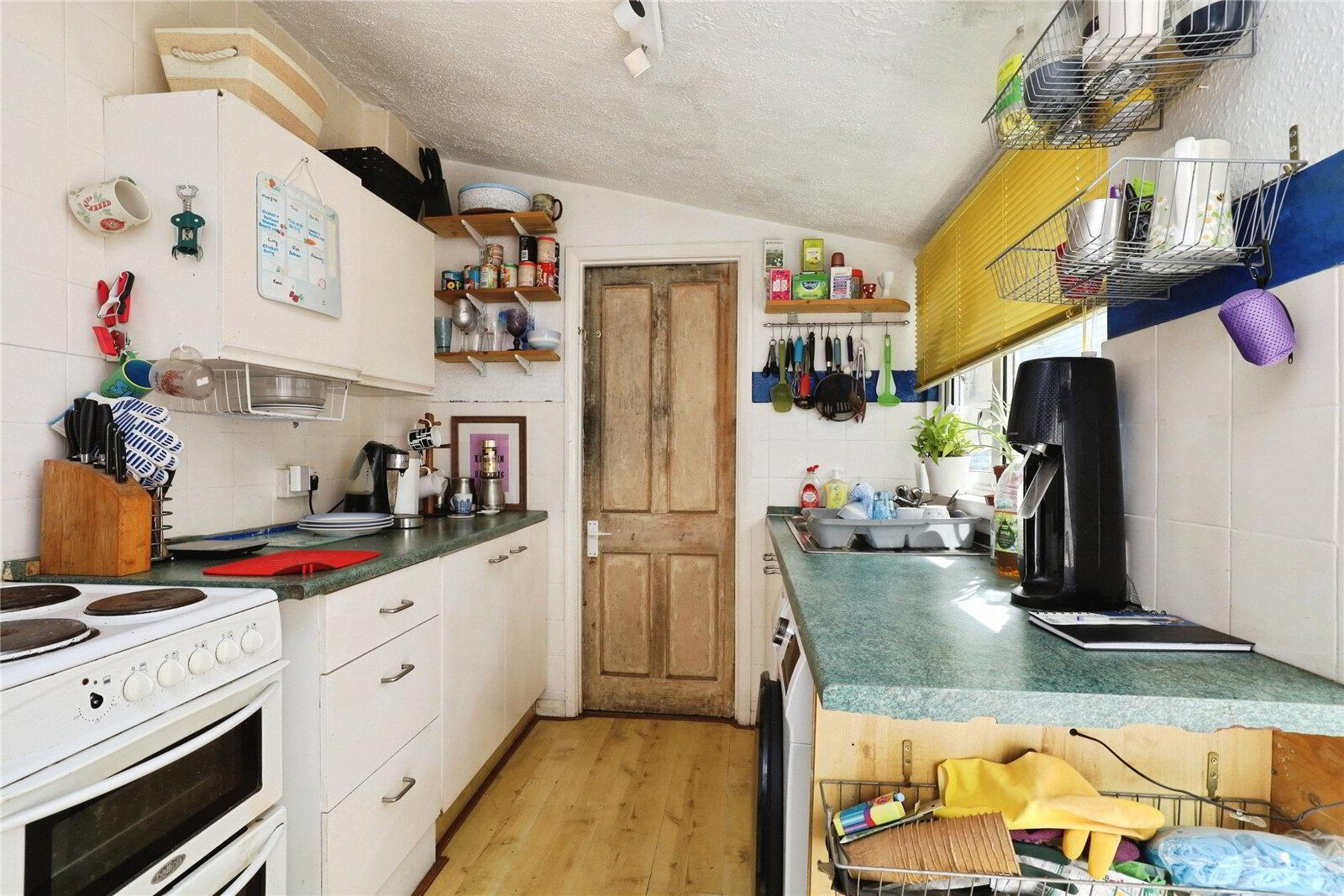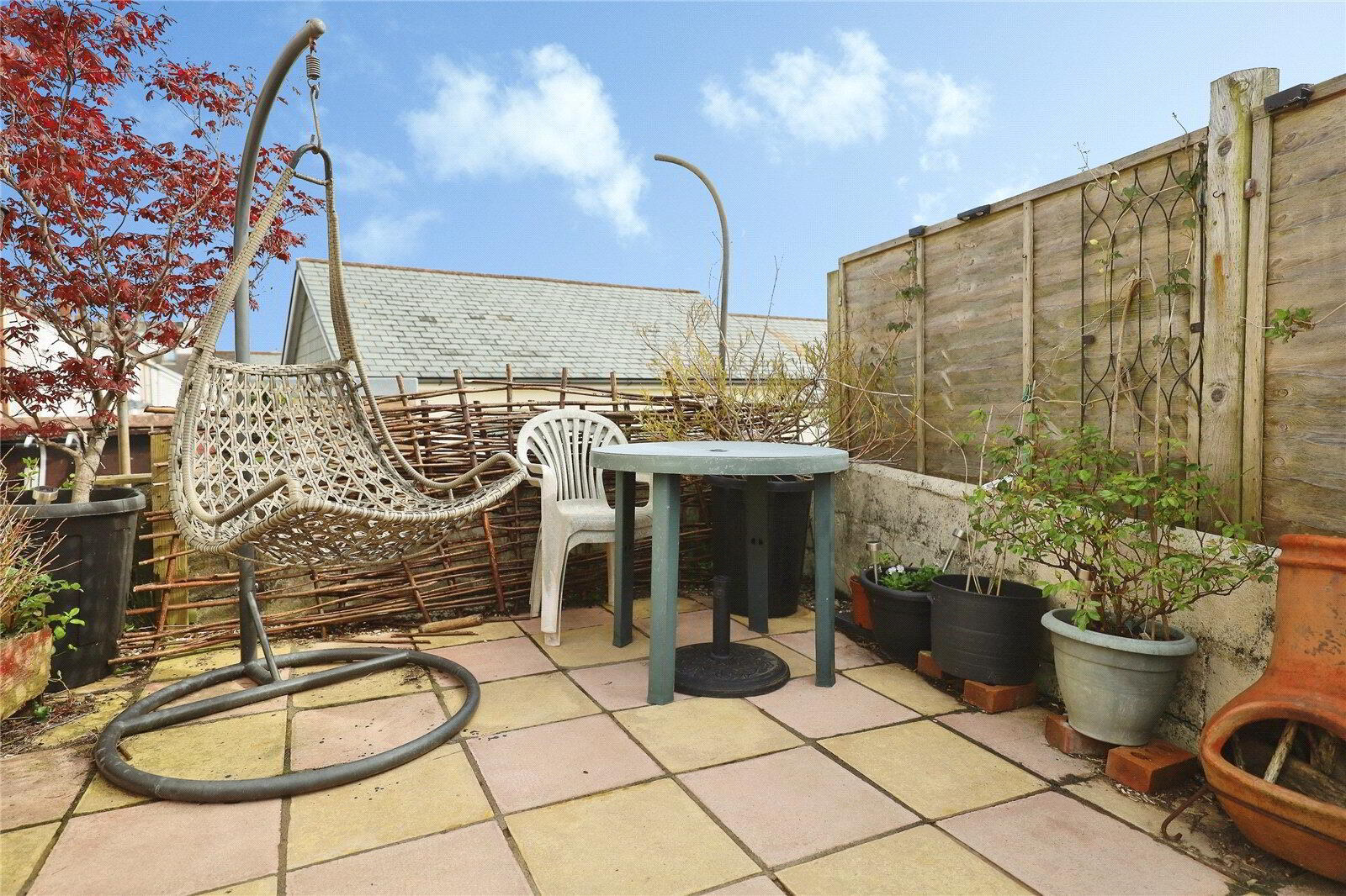 Outside, the property continues to impress with a sunny and low-maintenance garden area, accessed via a pathway past the side of the kitchen and steps leading up to a paved seating space. From here there are charming rooftop views stretching towards the countryside beyond, creating a really pleasant spot to sit outside and enjoy the sunshine. Just behind the kitchen there is also a very useful storage cupboard, ideal for recycling bins and general outdoor items.