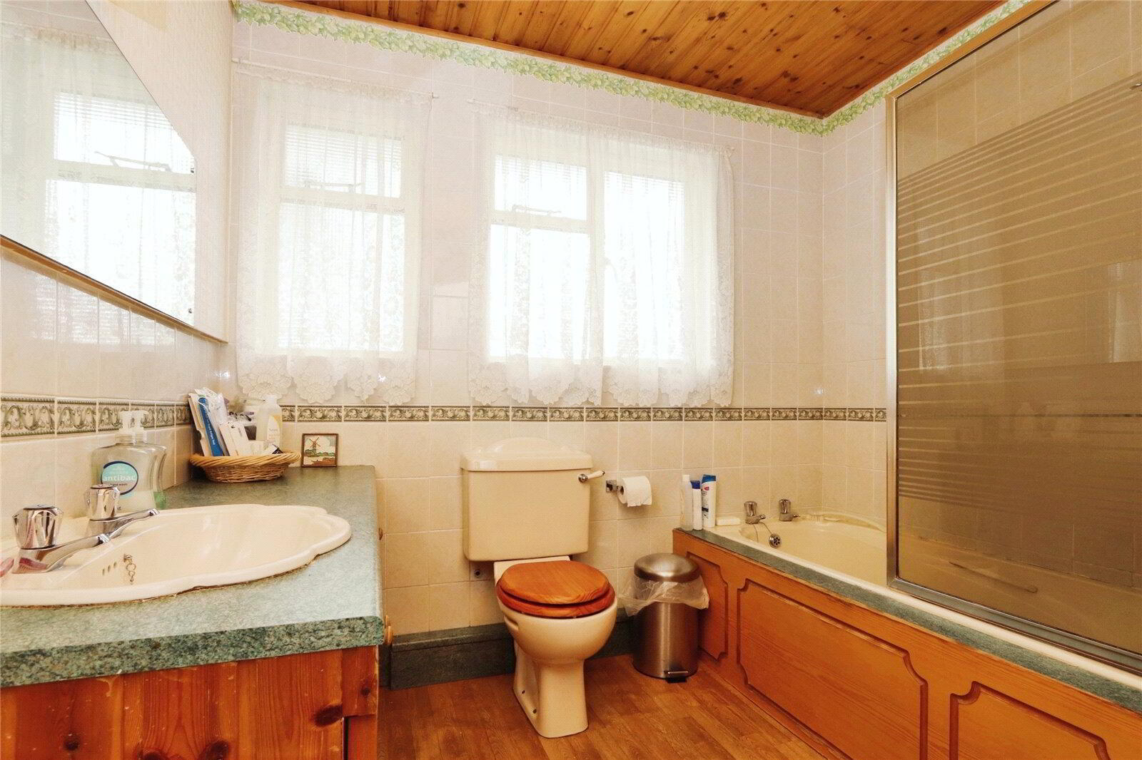 A well-proportioned Bathroom comprising bath with full wall tiling to area and mains shower over, close couple WC and cabinet mounted wash hand basin. Door to airing cupboard housing gas fired combination boiler. Radiator. Obscure window. - Kitchen / Diner