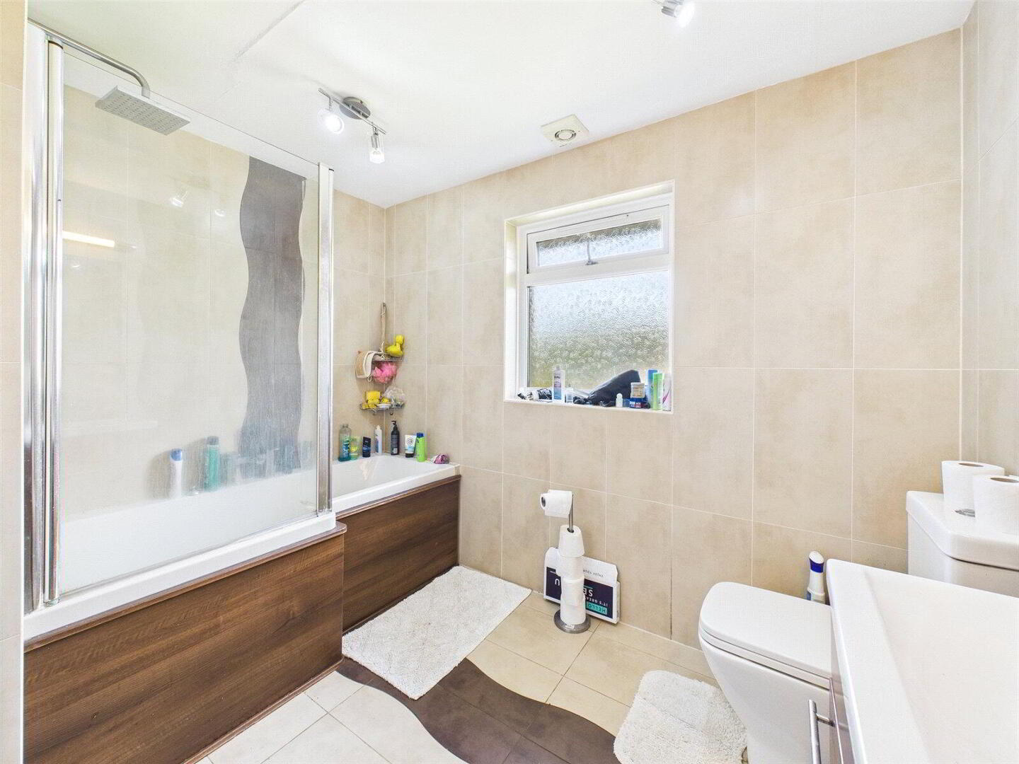 To the right of the hallway, the family bathroom is located, featuring a bath with overhead shower, WC, and basin, and benefitting from underfloor heating. All five bedrooms are true doubles, with three of them benefitting from built-in storage. The master suite is a standout feature, offering exceptional proportions and a luxurious en-suite bathroom complete with walk-in shower, WC, his-and-hers sinks, and underfloor heating.