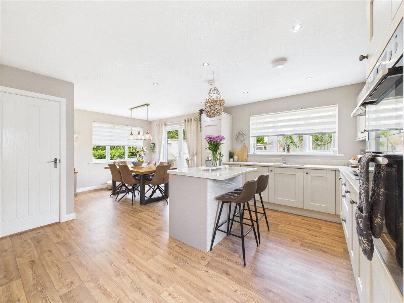 The heart of the home is the open-plan kitchen and dining area, which has been beautifully maintained and thoughtfully laid out to provide a sociable and functional space. The kitchen is fully fitted with modern units, integrated appliances, and ample worktop space, making it ideal for keen cooks and busy households. There is direct access to both the side and rear garden, offering seamless indoor-outdoor living.