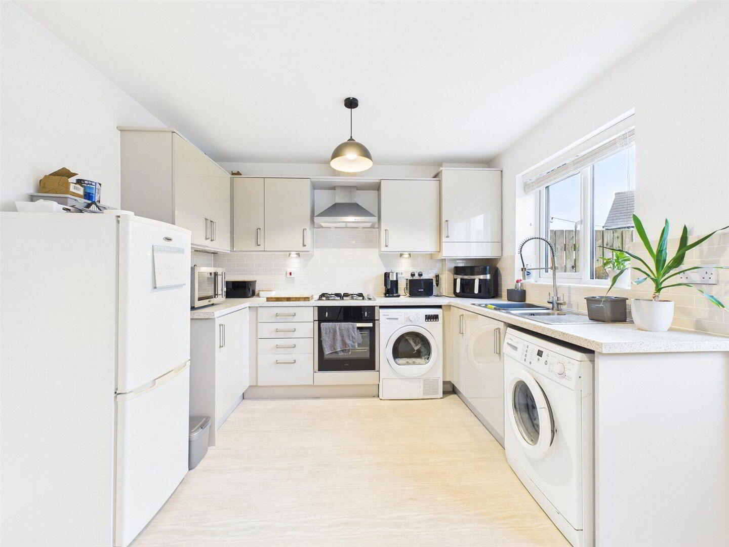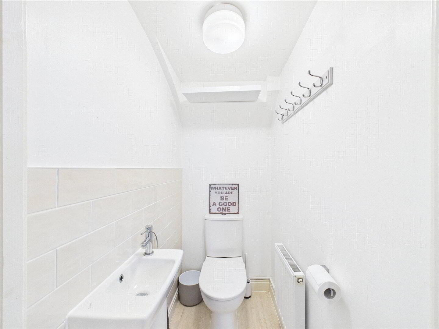 The living area leads through to a spacious kitchen/dining room, fitted with integrated appliances and offering ample storage throughout. This sociable space opens directly onto the rear garden, making it ideal for entertaining or enjoying meals outdoors. Just off the dining area is a downstairs WC, adding further convenience for everyday living.