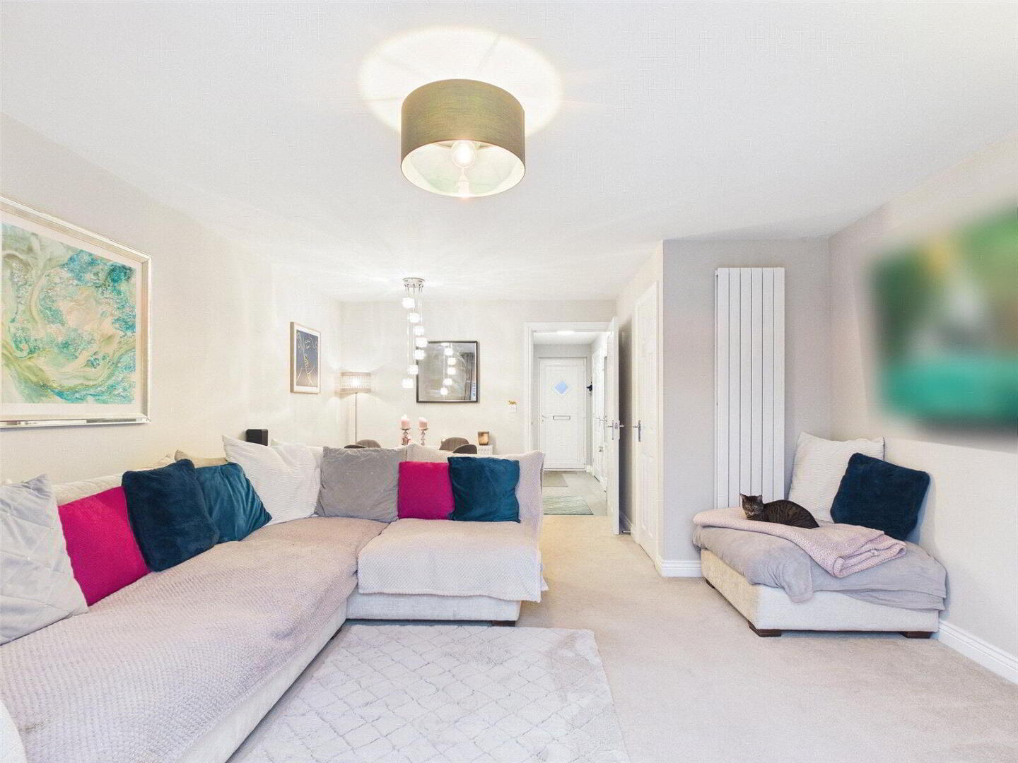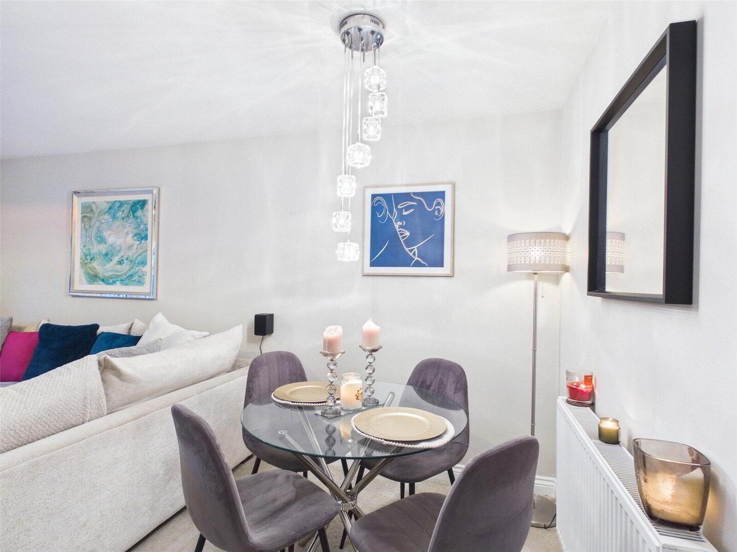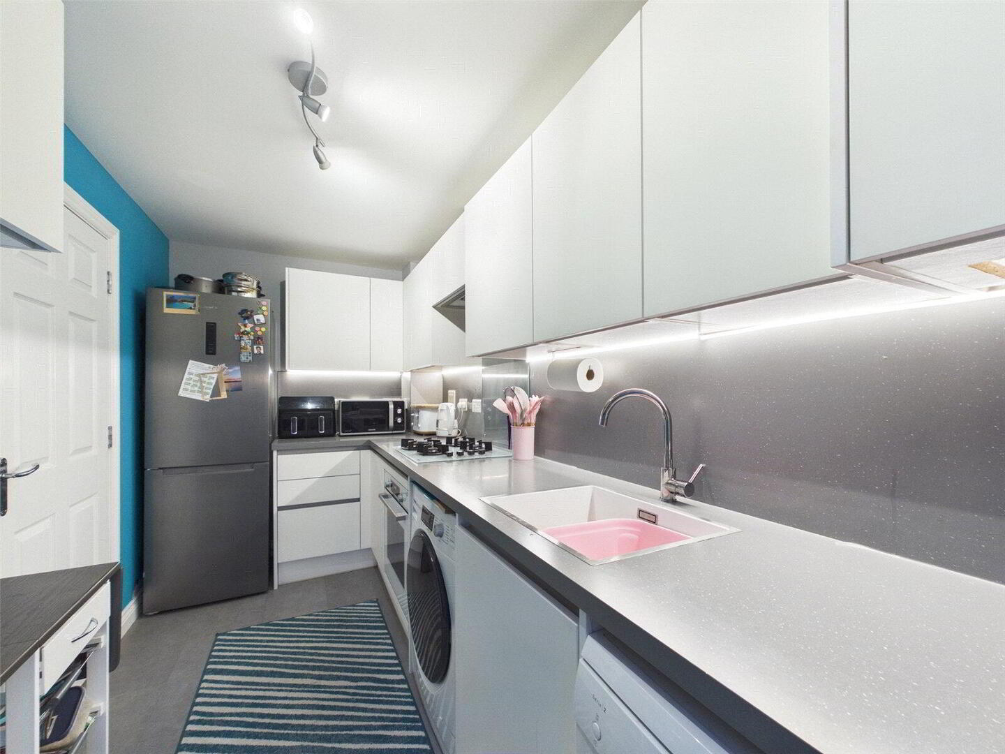 To the right, the kitchen is both stylish and practical. There is plenty of worktop space for preparing meals, generous storage, and integrated appliances already in place. You will also find space for a fridge freezer, plumbing for a dishwasher and washing machine, and a four point gas hob for keen cooks. LED lighting beneath the cupboards adds a modern, high end touch, while the newly installed boiler in October 2025 offers reassurance and efficiency for years to come.