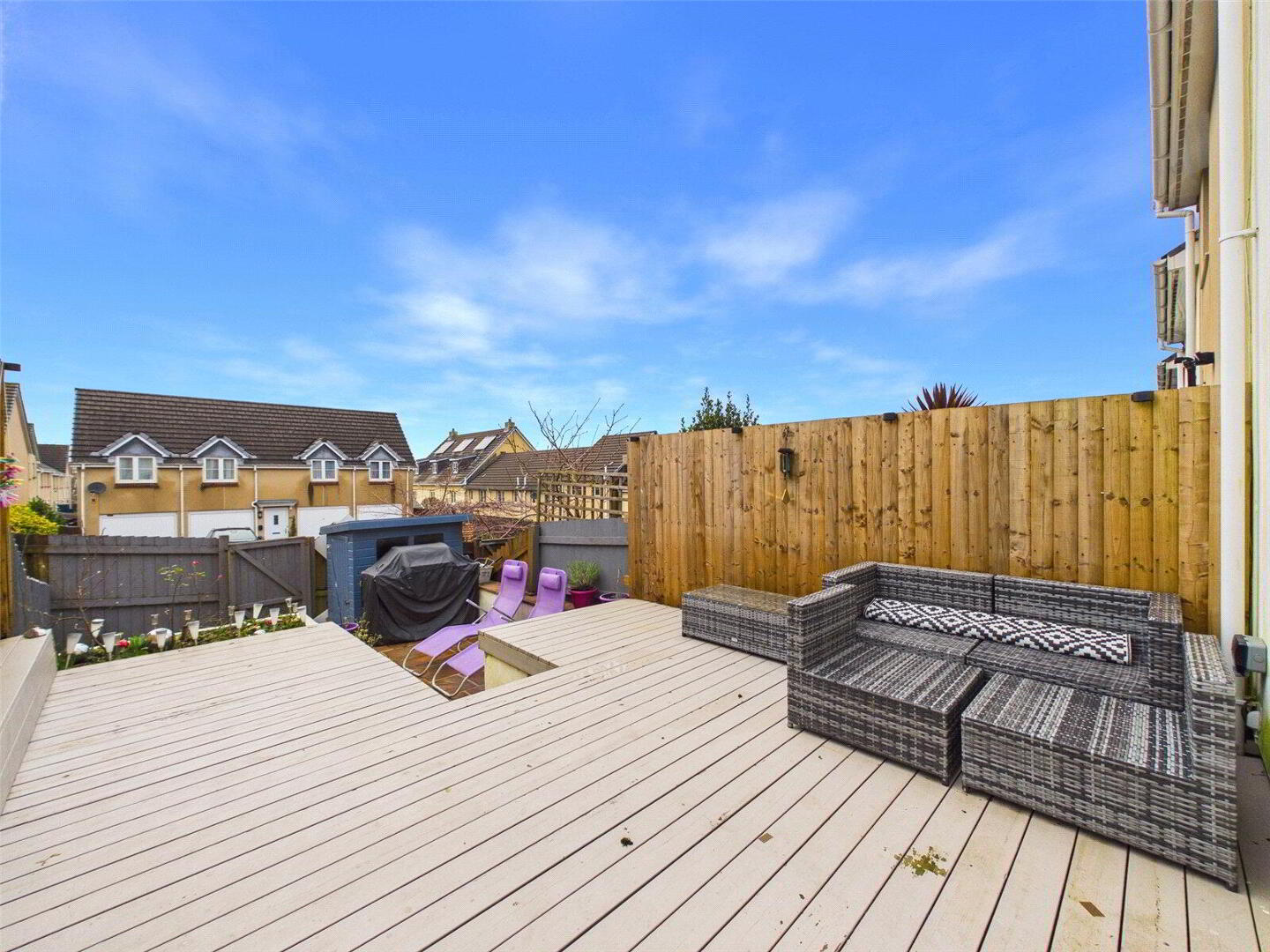 At the rear of the property is the heart of the home, a vibrant and comfortable living and dining space. It is a room that naturally brings people together, whether that is relaxing at the end of the day or hosting friends and family. French doors open straight out onto a raised decked garden, making it easy to enjoy outdoor dining in the warmer months and creating a lovely connection between inside and out.