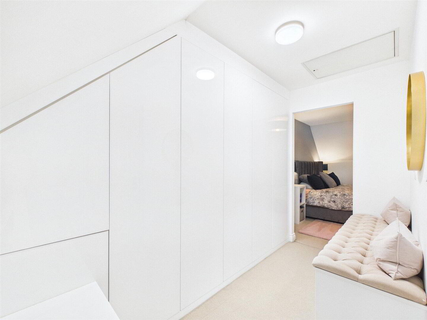 The top floor is dedicated to the impressive master suite. There is ample room for a super king size bed, which fits comfortably, along with additional furniture, creating a peaceful retreat at the end of the day. A walk in wardrobe fitted with built in Wren storage offers fantastic organisation and leads directly through to the en suite. Here you will find a walk in shower, basin, WC and additional storage cupboard, completing the interior of this lovely home.