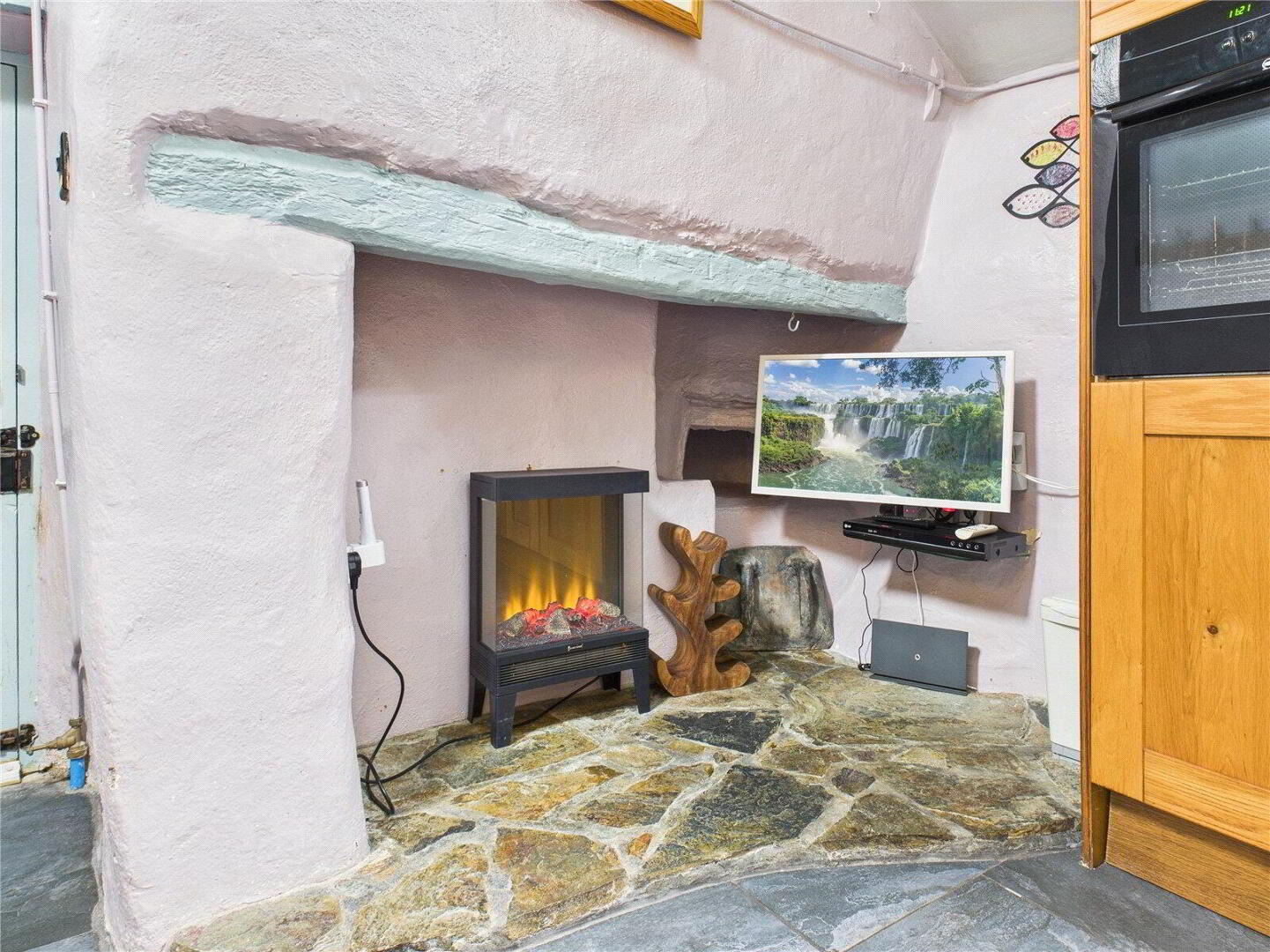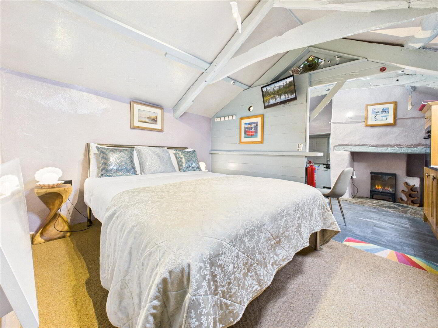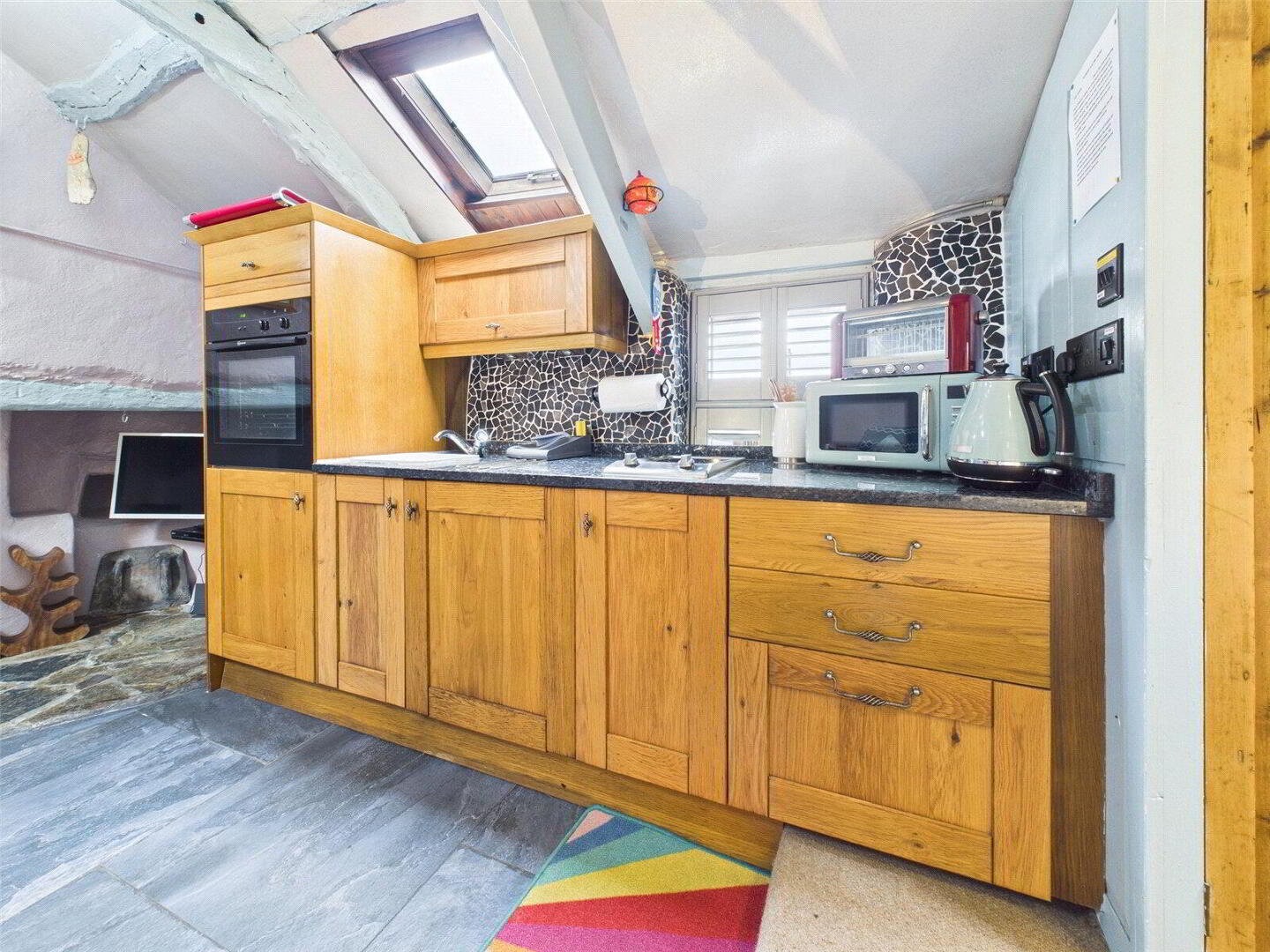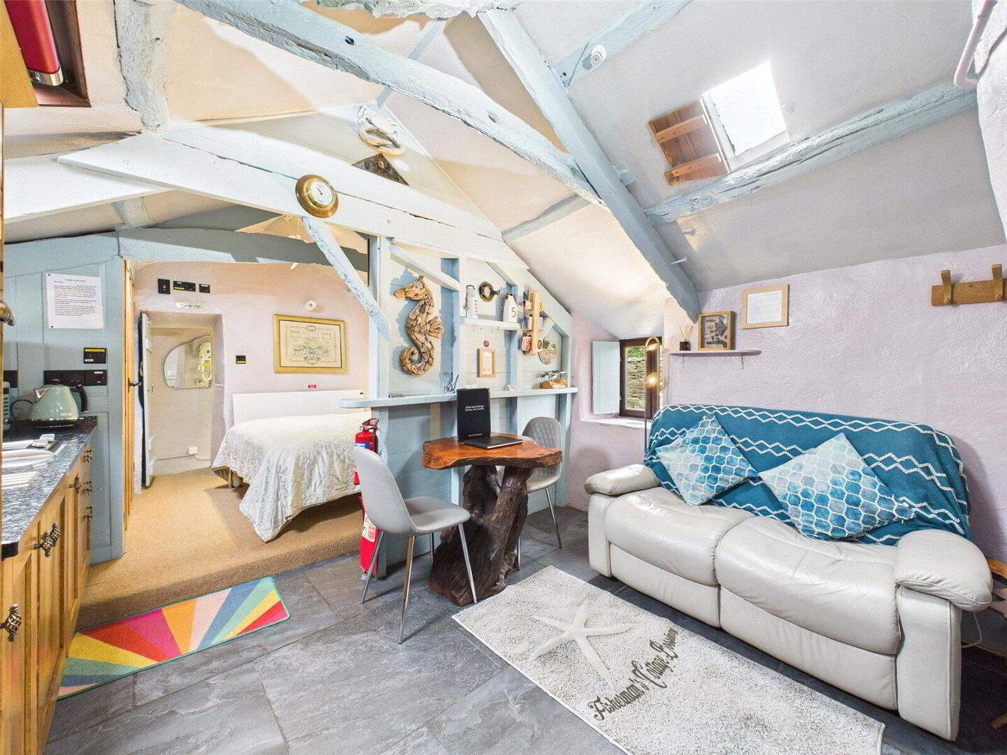 Stepping inside, you’re greeted by a warm and welcoming open-plan living space where historic charm meets modern comfort. The living area features a vaulted ceiling and former fireplace, creating a cosy yet airy atmosphere that’s perfect for relaxing after a day spent exploring the nearby beaches and cliff-top walks. The dual-aspect windows allow natural light to flood in, offering glimpses of the sea, while the stylish kitchen area includes granite worktops, an electric oven and hob, and an integrated fridge – ideal for preparing a quiet supper for two.