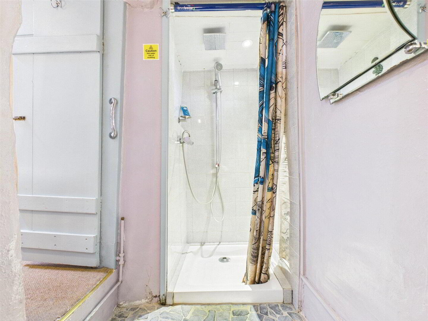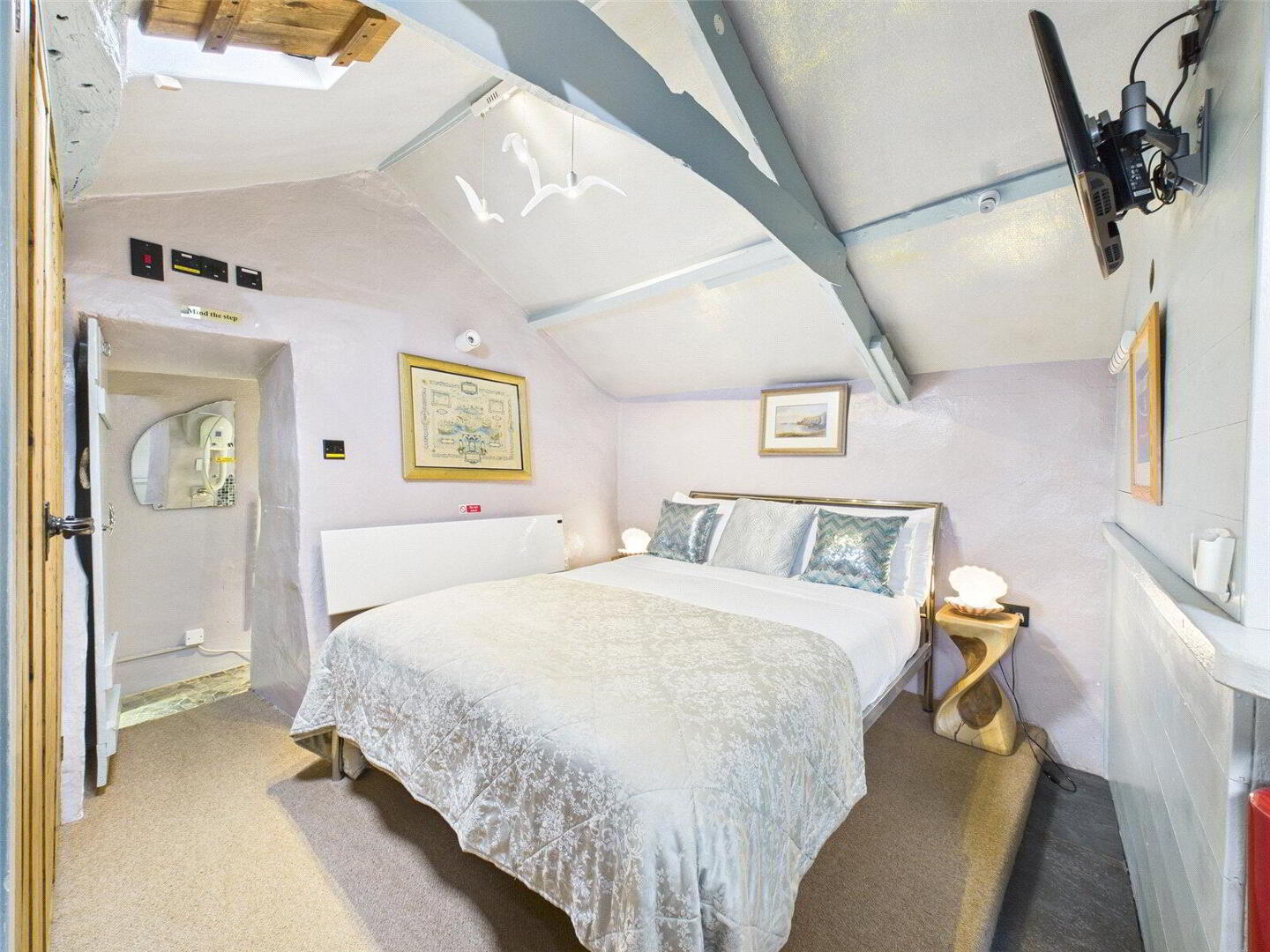 Flowing through to the bedroom, the space continues the cottage’s calm and inviting feel, with built-in storage and a skylight that fills the room with natural light. The adjoining shower room has been tastefully finished with modern tiling, a rainfall shower, and a heated towel rail, adding a touch of luxury.