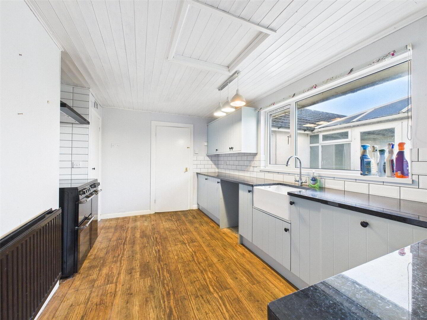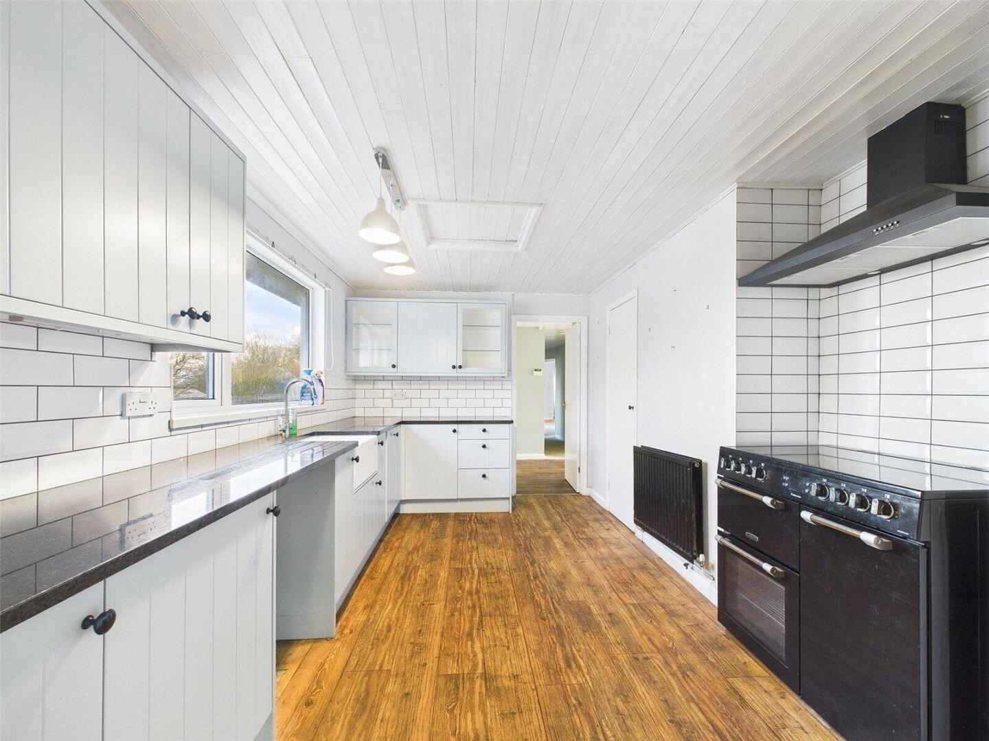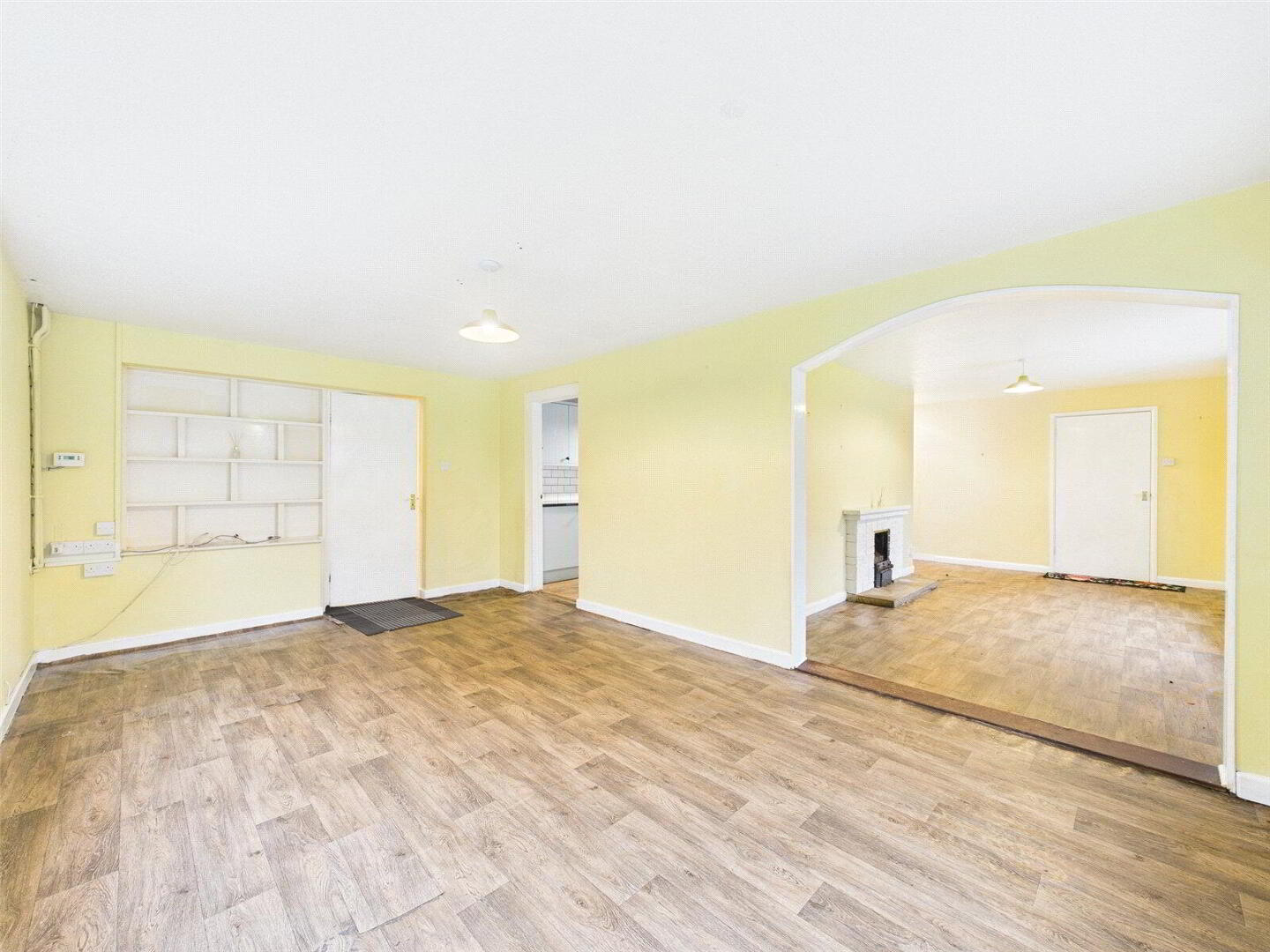 Internally, a spacious L-shaped living and dining room is positioned to the front of the property and features an attractive fireplace with open fire. The recently installed and well-presented kitchen is fitted with a comprehensive range of base and wall units with granite work surfaces, a built-in shelved pantry, and a recessed area housing a range-style cooker (available by separate negotiation).
