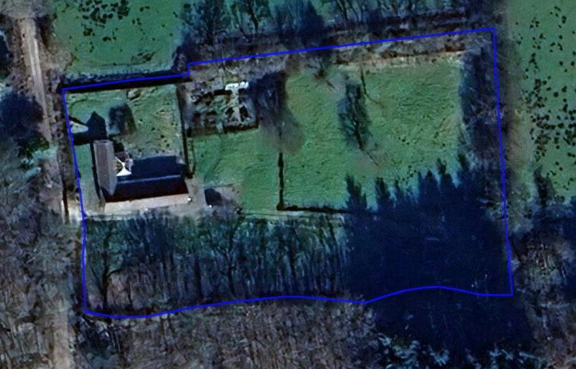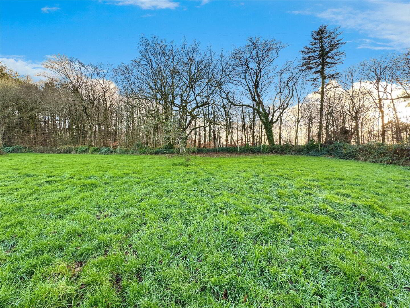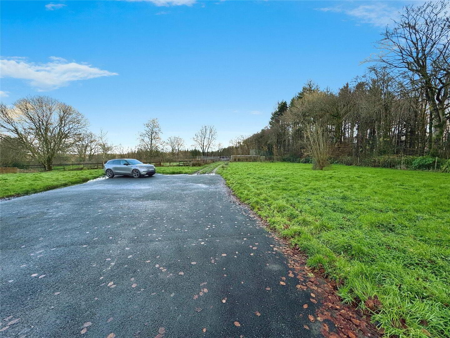 A concrete yard which leads to an impressive modern agricultural barn with adjoining storage/workshop space and stabling. The grounds include large, level gardens and a paddock, providing excellent potential for smallholding or equestrian use. The property enjoys a particularly attractive setting, adjoining open farmland to the rear and bordered by mature woodland to the front, offering privacy and a semi-rural outlook.