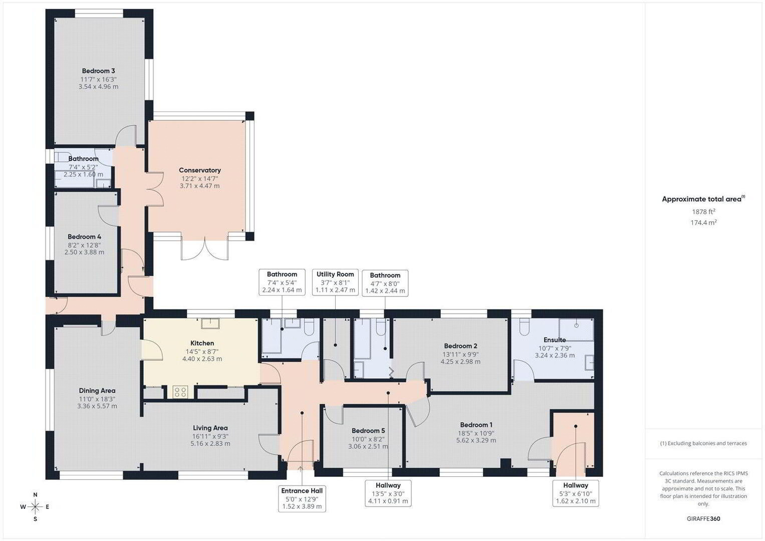 The principal bedroom is a generously proportioned room with two front-facing windows, an en-suite wet room, and its own entrance hallway. This area is considered to offer potential for conversion into a self-contained annexe, subject to the necessary approvals. Bedroom two enjoys an attractive rural aspect to the rear and also benefits from an en-suite. Three further spacious double bedrooms are served by two family bathrooms. A large conservatory provides additional living space with views over the rear gardens.