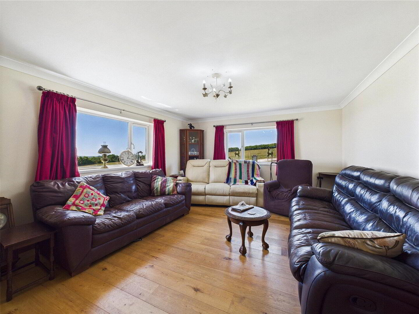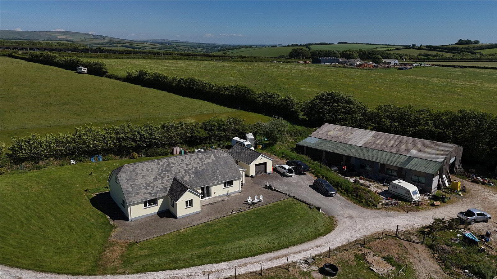 Set across approximately 32 acres of rolling countryside with breathtaking coastal views, View Farm represents an exceptional opportunity to secure a prestigious rural retreat. This remarkable estate features a spacious three-bedroom bungalow complemented by three versatile occasional rooms, providing superb flexibility for guest accommodation, home offices, or creative spaces. A stunning open-plan kitchen and dining area flows seamlessly into expansive living spaces, perfectly designed to capture panoramic sea and countryside vistas through generous glazing.