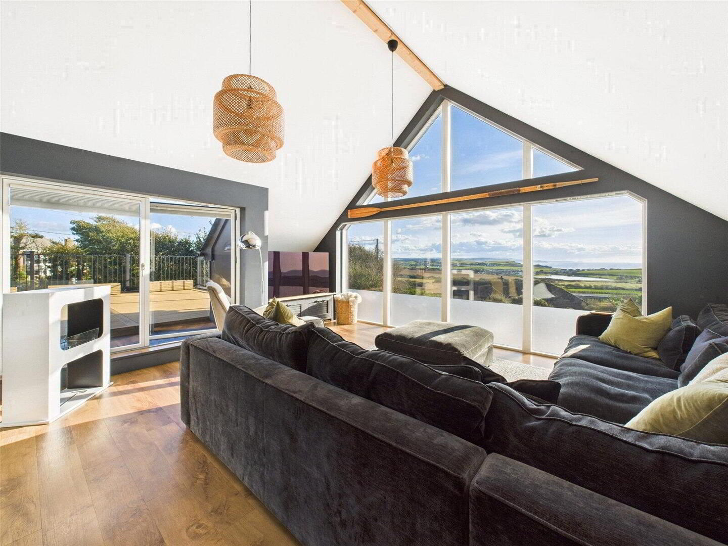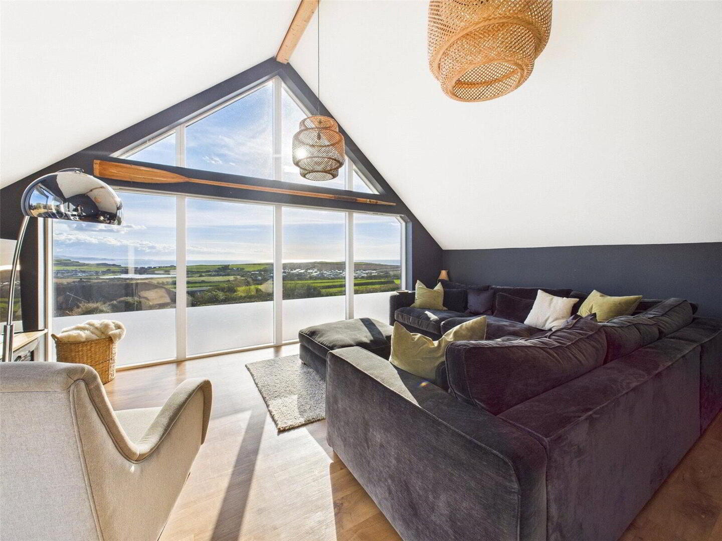 Upstairs, the dramatic vaulted living room is a true highlight, with a wall of glass framing far-reaching sea and countryside views, and doors opening onto a large roof terrace – the perfect vantage point for sunsets over the Atlantic.