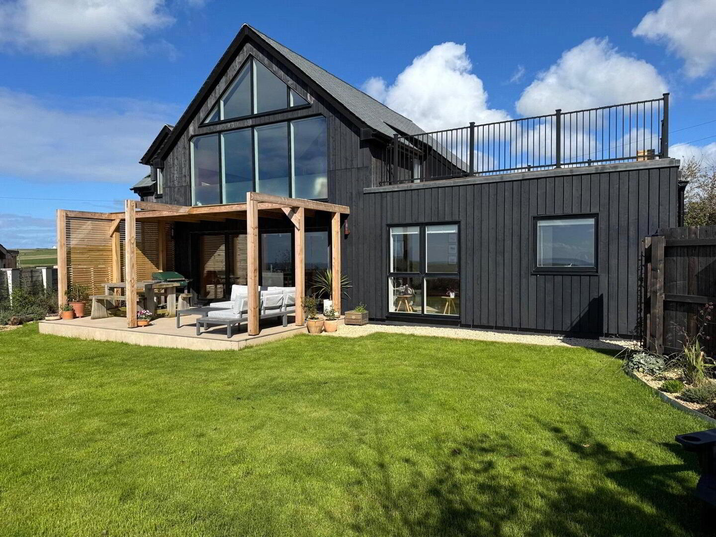 • Additional enclosed garden to the rear/left-hand side with lawn, sheds, Outside shower and play space