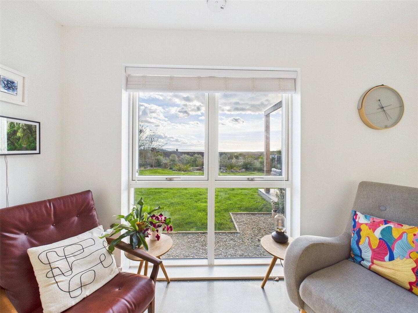 A spacious entrance hall with feature staircase sets the tone for the home, opening into a superb open-plan kitchen/dining/living area. This social space is flooded with natural light from full-height windows, bi-fold doors, and enjoys uninterrupted views across the garden and coast. The bespoke kitchen is beautifully appointed with a central island and contemporary fittings, making it ideal for entertaining and family life.