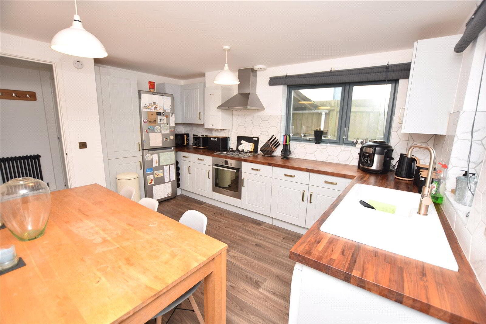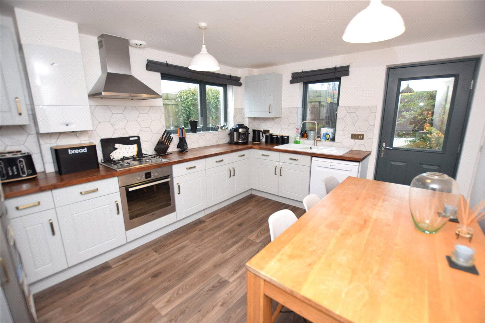 This modern kitchen/diner benefits from a range of base and wall units with laminate roll worktops over incorporating a ceramic sink/drainer unit with mixer tap. Integrated oven with 4 ring gas hob above and extractor hood over. Space for dishwasher and fridge freezer. Wall mounted combination boiler. Ample space for large dining table. Storage cupboard with plumbing for washing machine. Two windows to the side and rear elevation. Door to rear elevation leading onto the garden. - WC