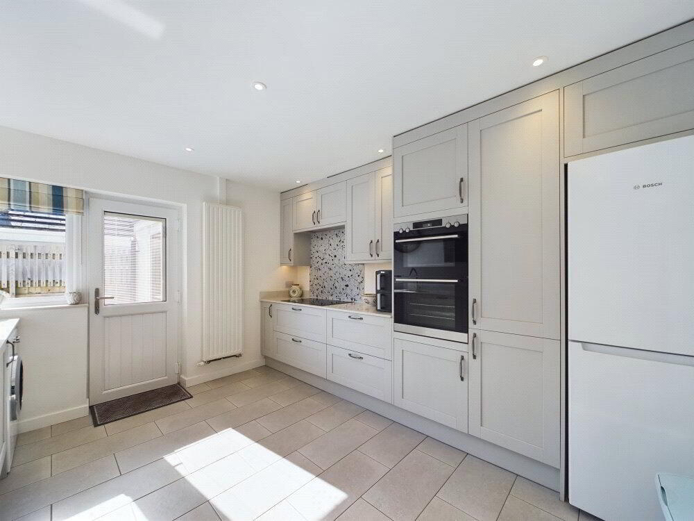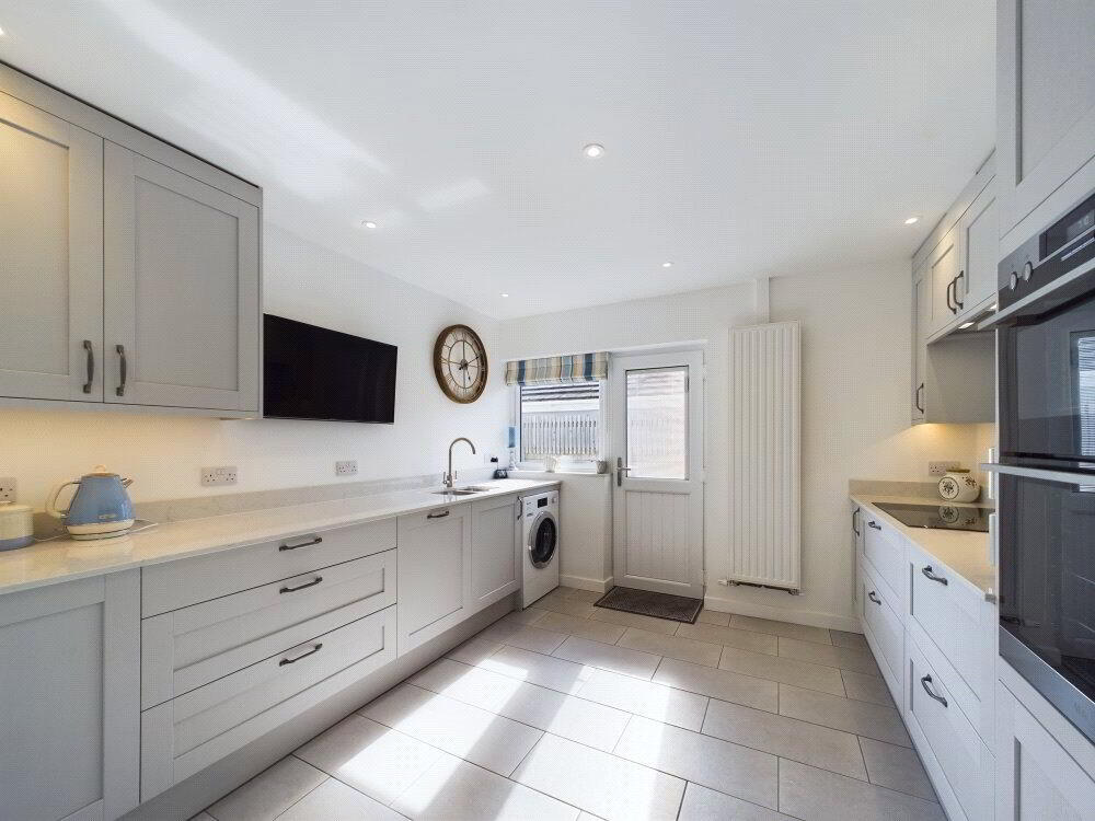 A superb recently fitted kitchen comprising a range of base and wall mounted units with quartz worksurfaces over incorporating inset stainless steel 1 1/2 sink with cut drainer grooves, integrated AEG appliances include 5 ring induction hob with extractor hood over, high level double oven and dishwasher. Recess for fridge freezer with space and plumbing for washing machine. Cupboard housing wall mounted gas combi boiler. Porcelain tiled flooring. Door and window to side elevation.