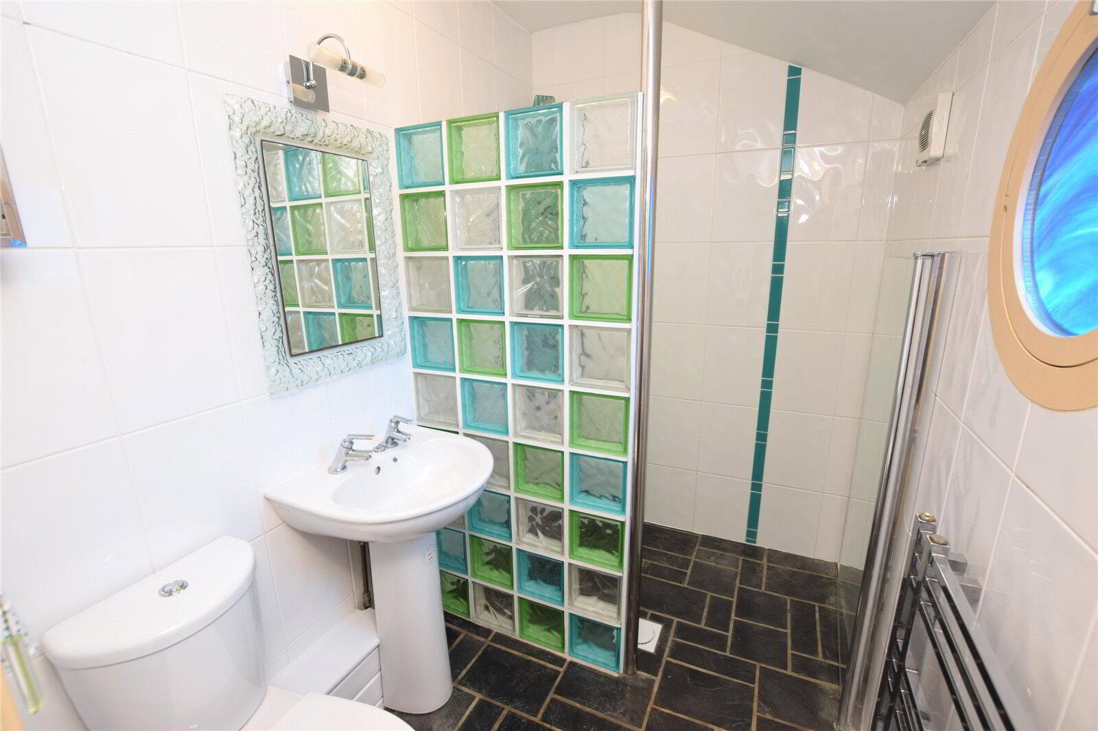 Comprising a large shower cubicle with mains fed power shower over, low level WC and pedestal hand wash basin. Chrome heated towel rail. Stained glass port hole window to side elevation.