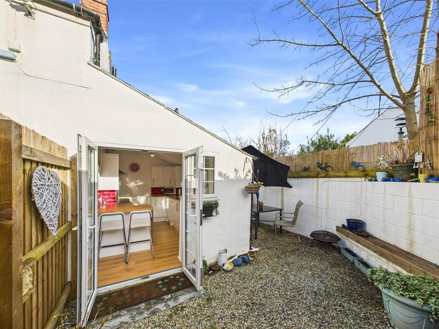 Externally, the property continues to impress. To the front is an enclosed patio area, ideal for outdoor seating or dining, with direct access from the kitchen. In addition, there is a large gravelled parking area providing off-road parking for two vehicles, a rare and valuable feature within this location.