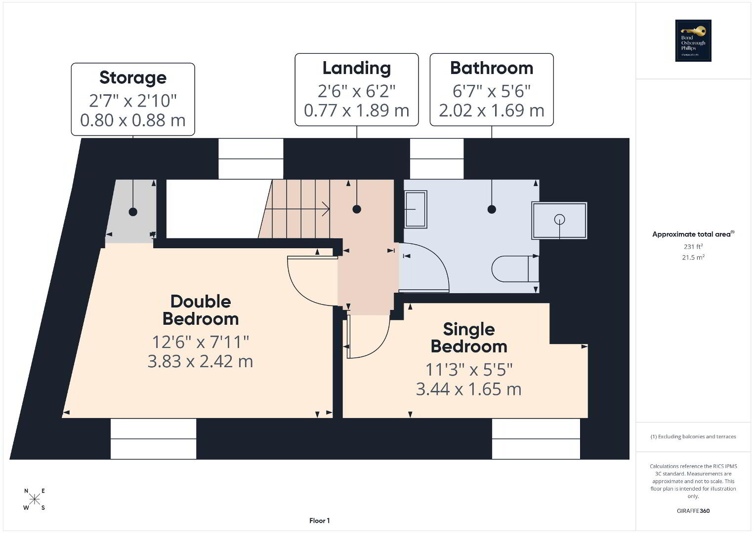 The first floor comprises two well-proportioned bedrooms and a family bathroom. The generous double bedroom features a useful built-in storage nook, while the second bedroom is a comfortable single, perfectly suited as a child’s bedroom, home office or guest room. Both bedrooms enjoy large front-facing windows, providing pleasant outlooks and excellent levels of natural light. The family bathroom is well sized and fitted with a modern walk-in shower.