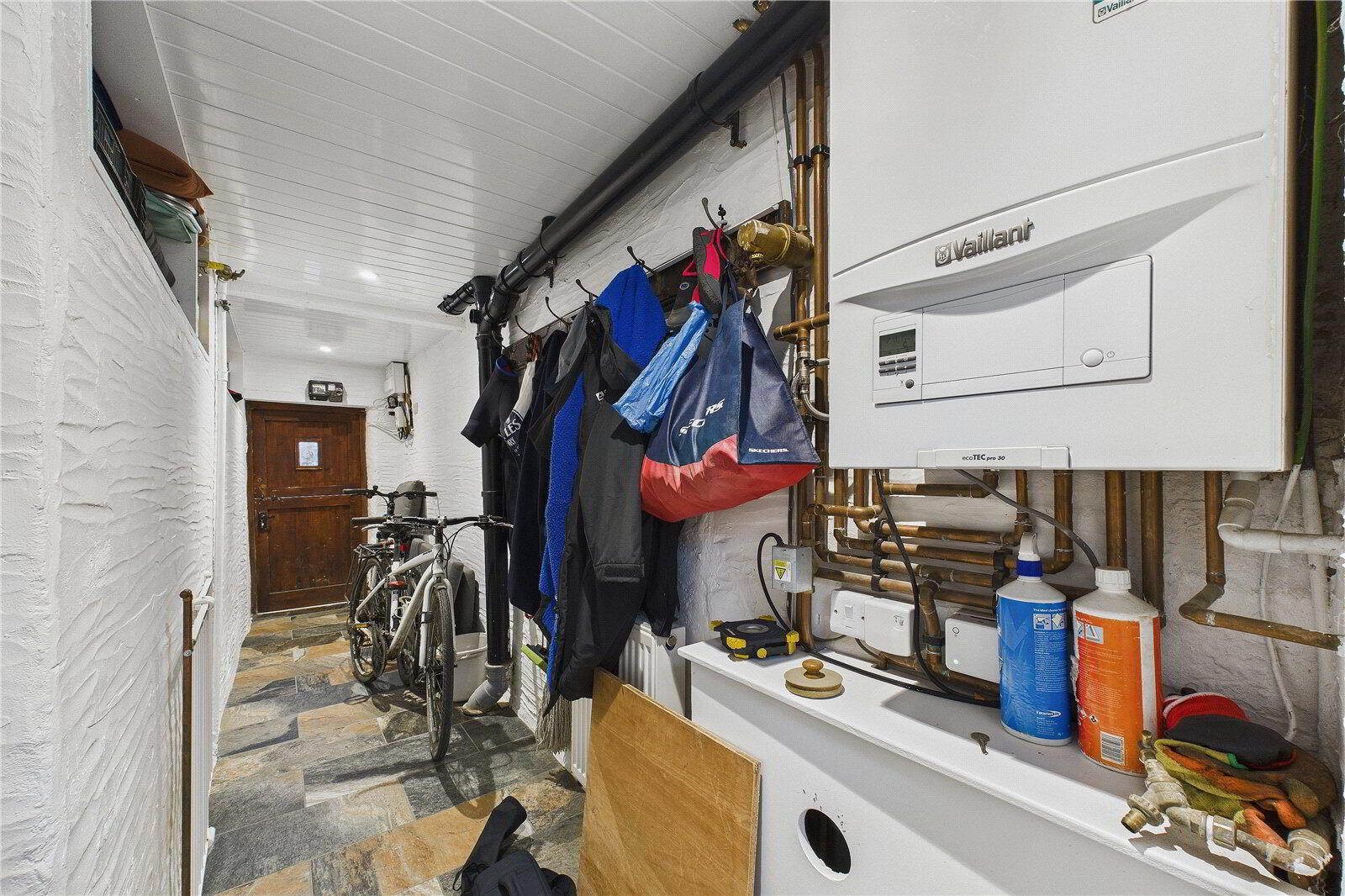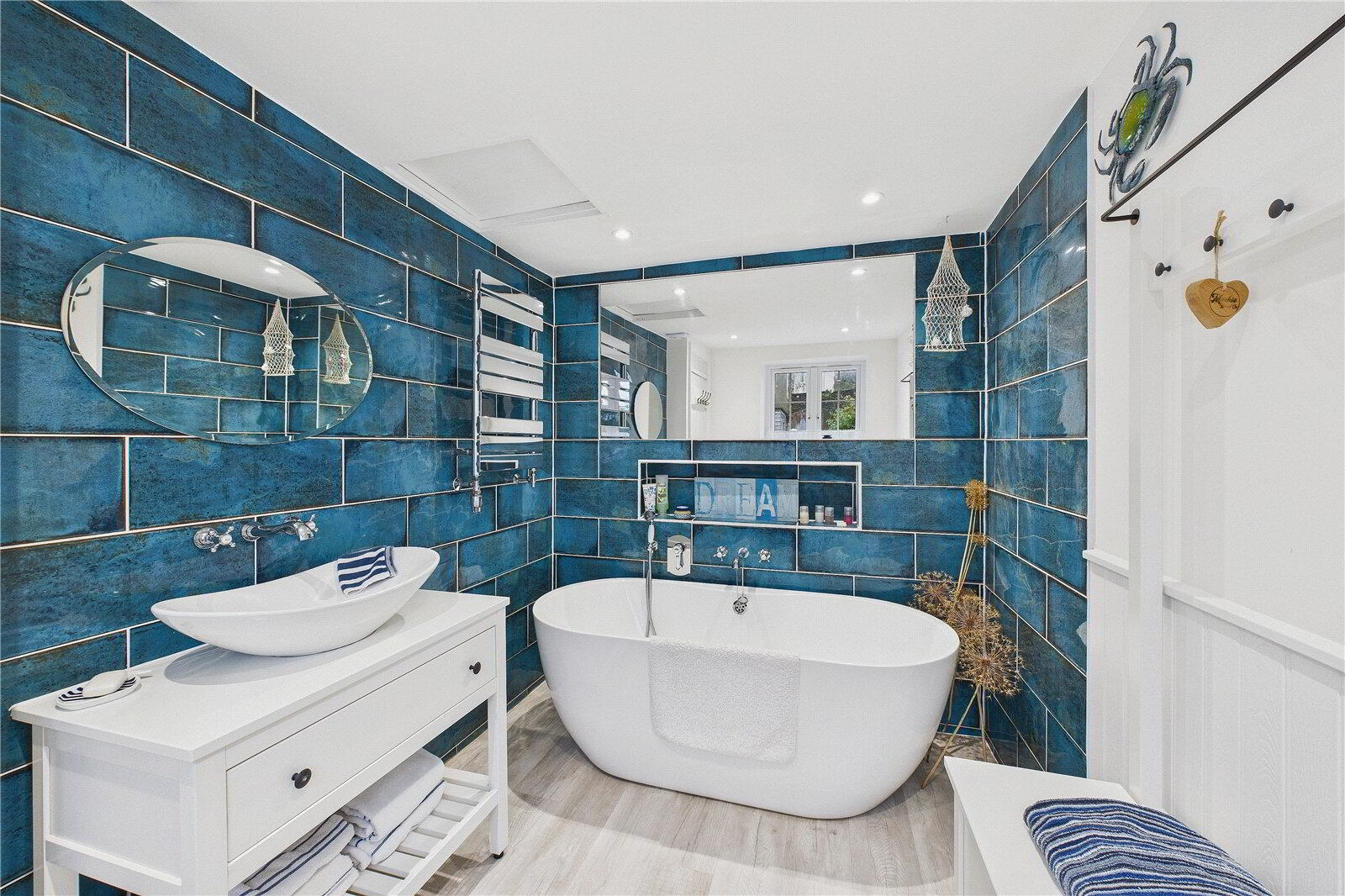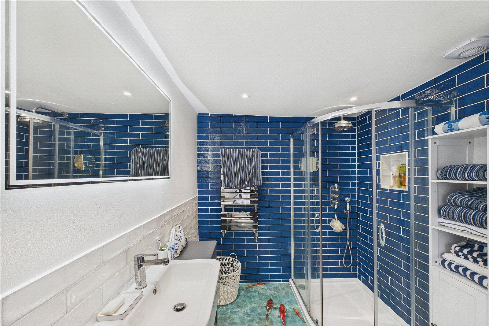 Inside, the home offers two generous double bedrooms, including a principal bedroom with a stylish en-suite bathroom. A second contemporary bathroom is located separately from the second bedroom and includes a luxurious free-standing bath, a rain shower and a heated towel rail.