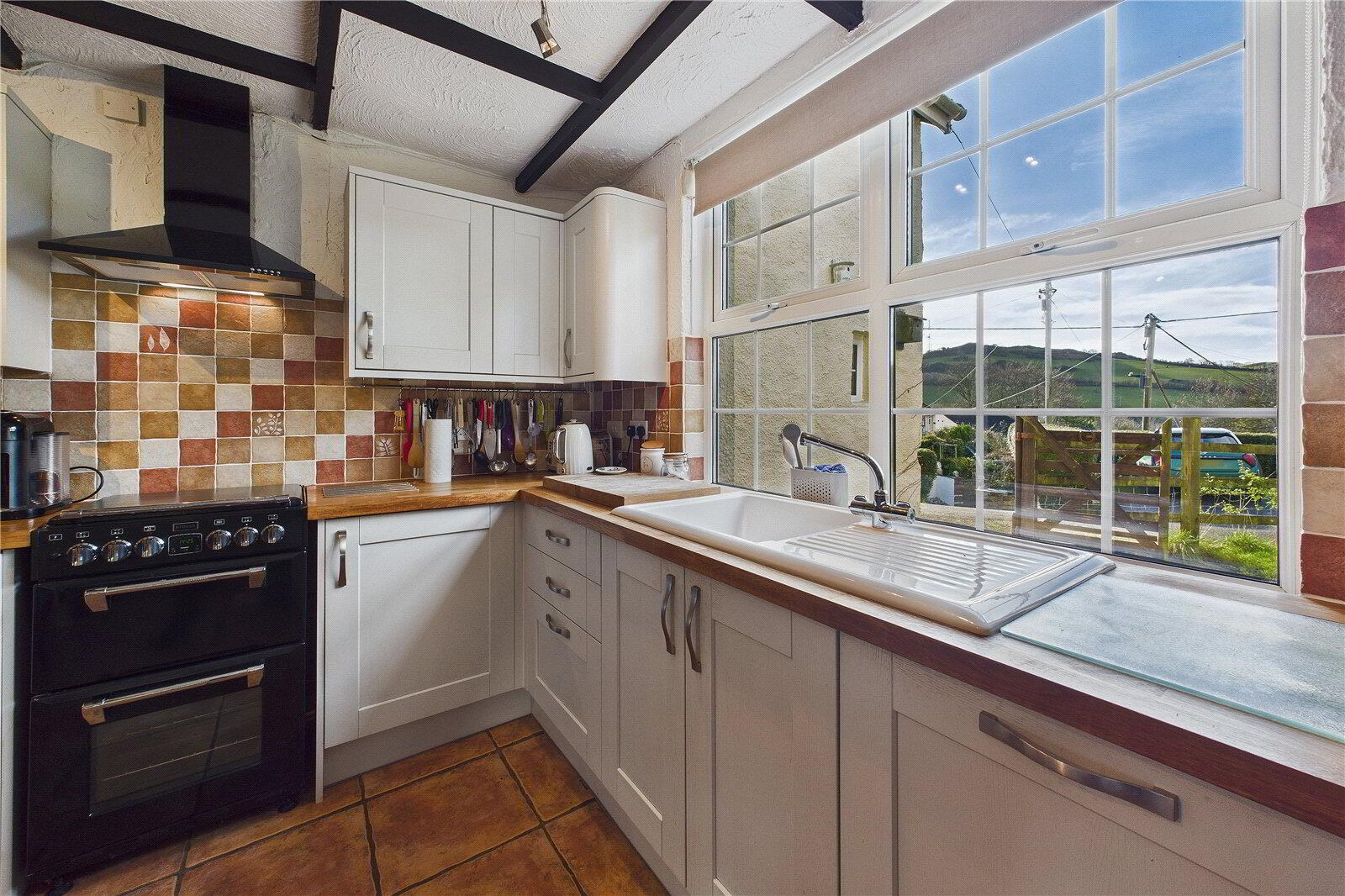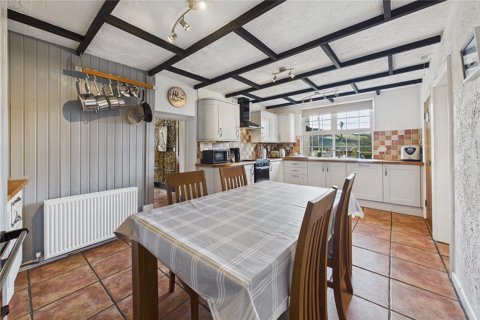 The open-plan kitchen and dining room forms the heart of the home, fitted with wooden worktops, a ceramic sink, built-in pantries and tiled flooring, and anchored by a traditional Rayburn. This bright and sociable space enjoys pleasant outlooks and connects to a generous utility room and a downstairs bathroom.