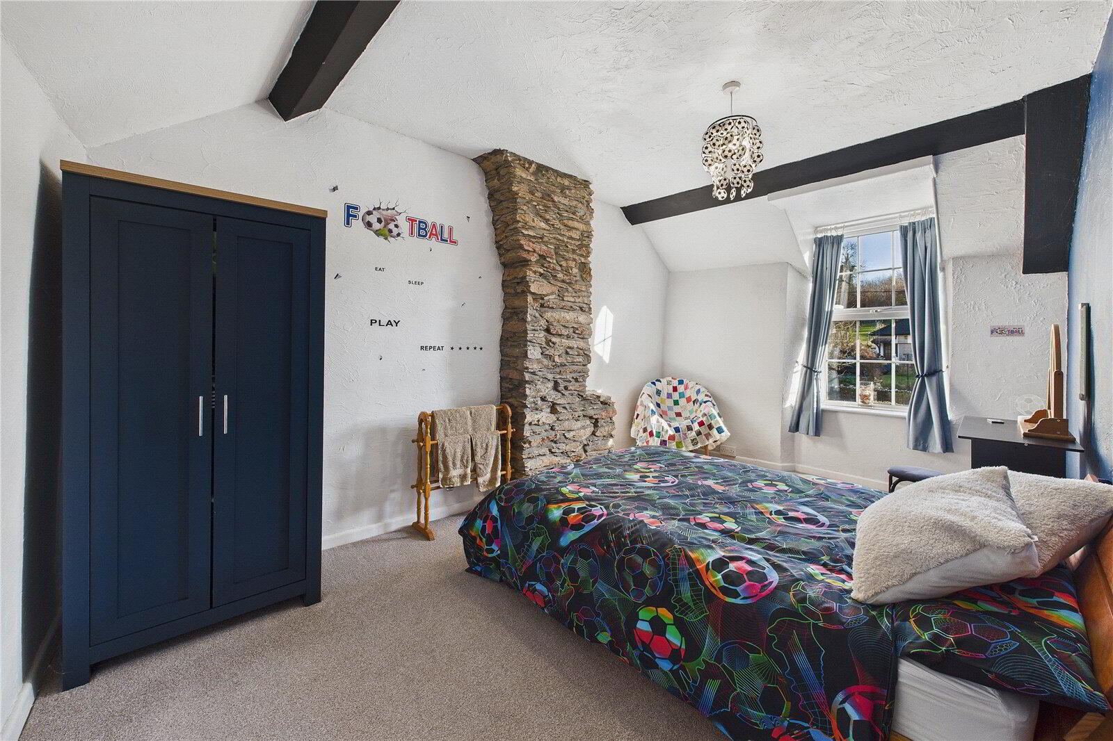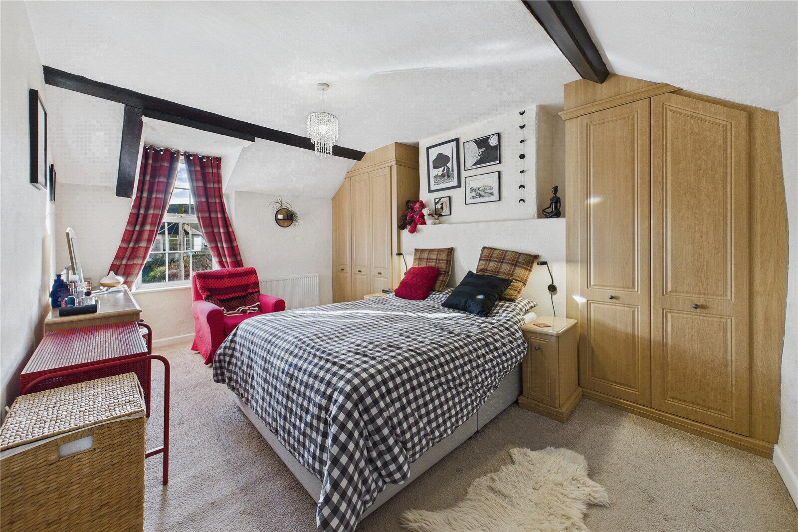 The property is full of charm, showcasing exposed wooden beams, deep-set windows and impressive fireplaces throughout. The main sitting room centres around a striking inglenook fireplace with exposed stone surround, while a second reception room, also with a character fireplace, provides flexible additional living space.