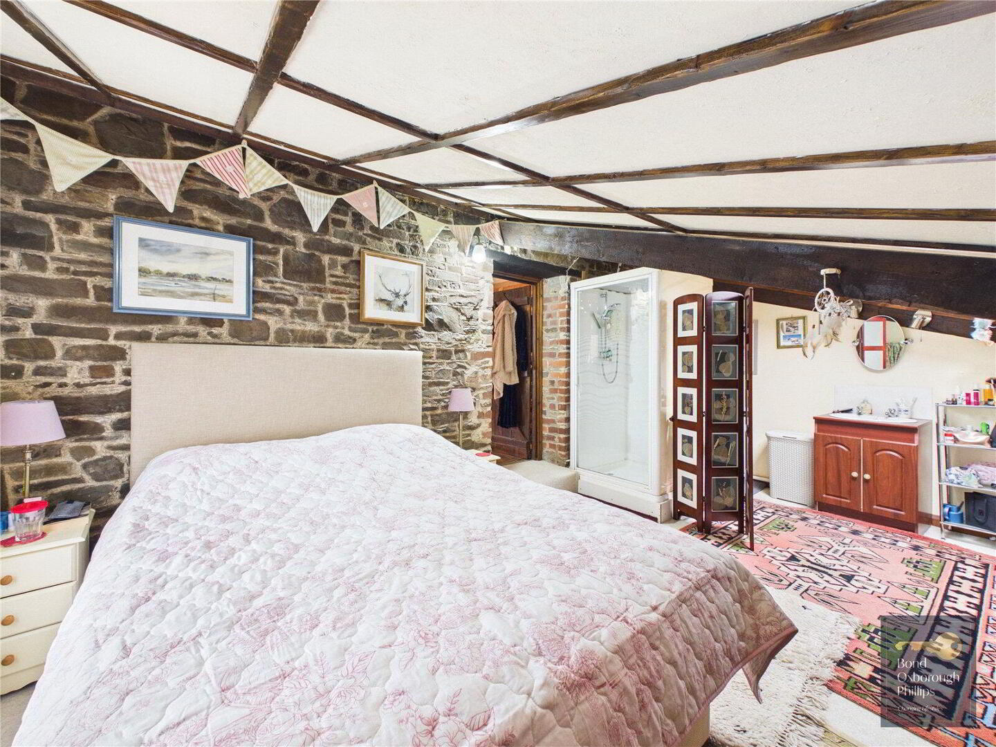The final bedroom continues the theme of character and charm, boasting its own stone feature wall and a distinctive open-plan layout incorporating the shower area. The result is a boutique-style suite with personality and flair, blending rustic textures with contemporary comfort.