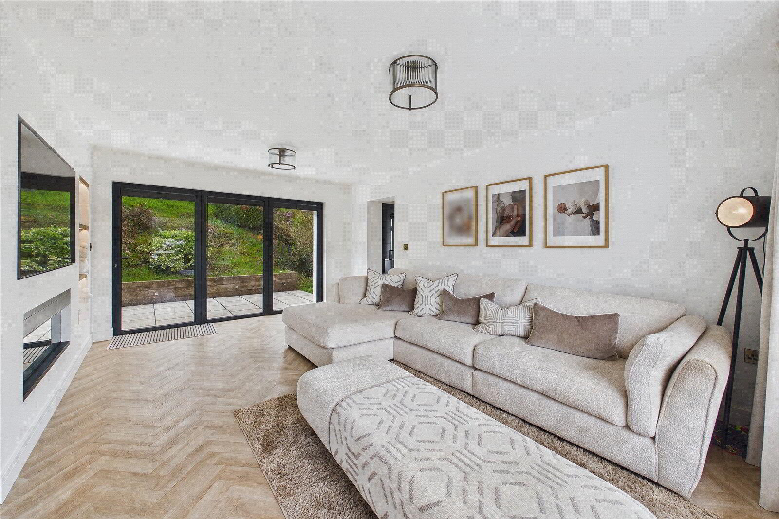 The sitting room provides a superb balance of comfort and style, enhanced by its dual-aspect design. To the front, it enjoys attractive views across the surrounding countryside and towards the local church, while to the rear, bi-fold doors open out onto a patio terrace, creating a seamless connection between indoor and outdoor living. This space is perfectly suited to both relaxed evenings and entertaining, allowing natural light to flood the room while making the most of the property’s private and picturesque setting.