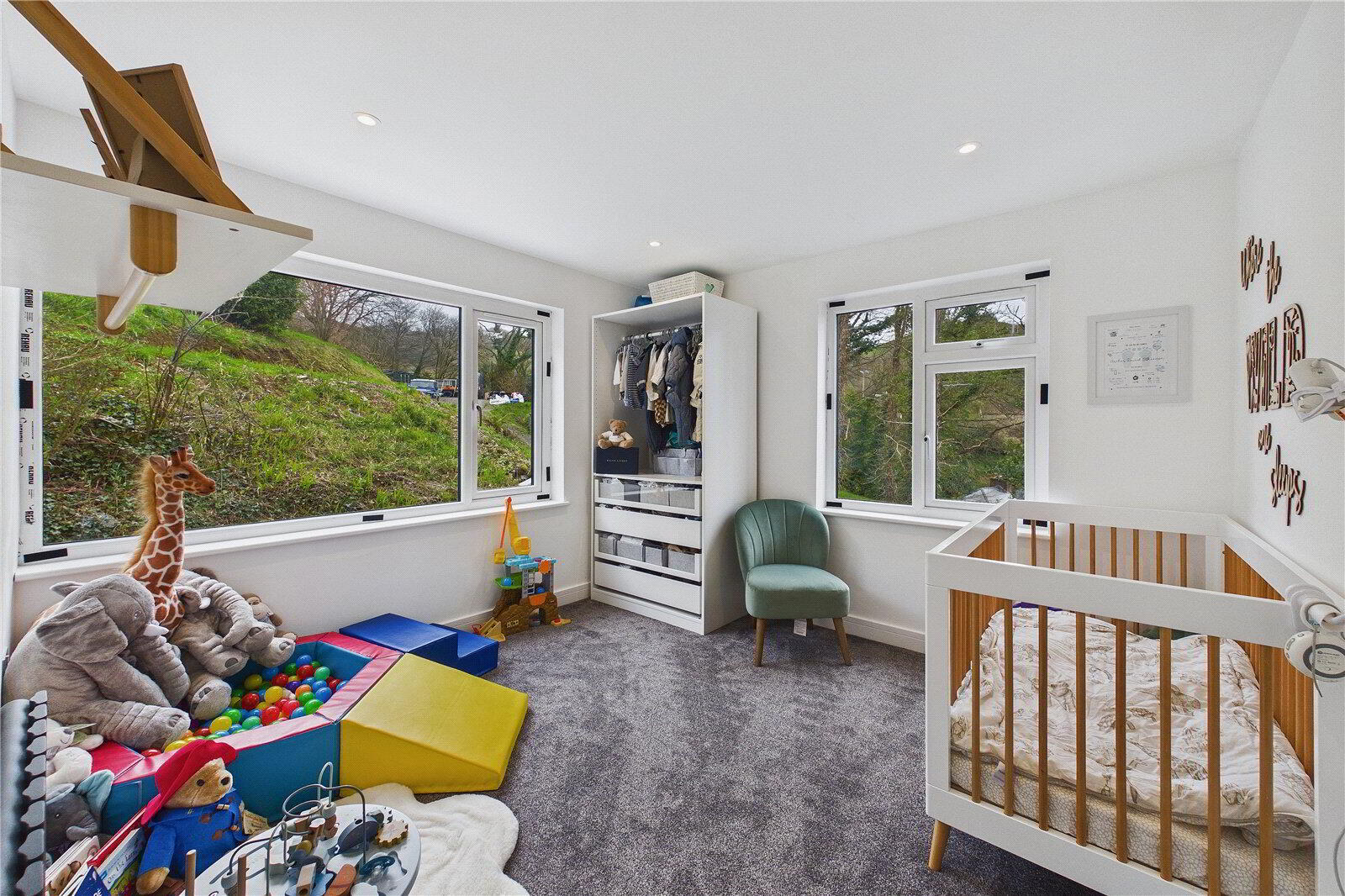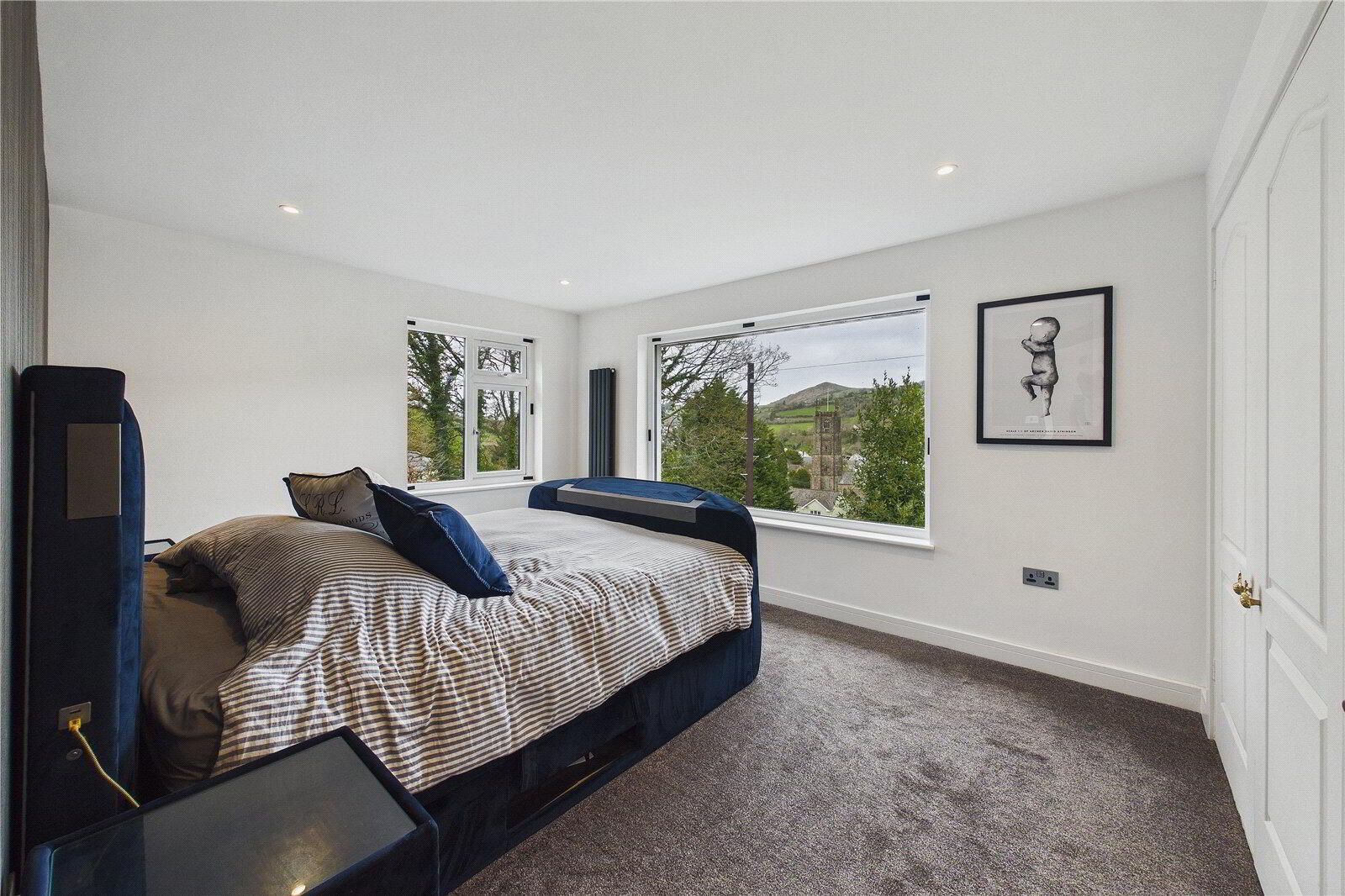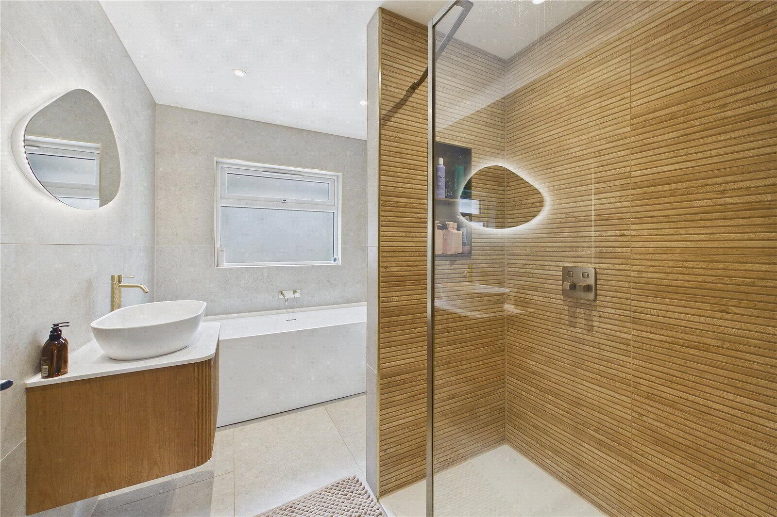 All four bedrooms are generous doubles, each finished with soft carpeting for comfort, with the principal bedroom benefitting from built-in wardrobes. The bathrooms have been finished with a clear attention to detail, most notably the main family bathroom which features a beautifully tiled double walk-in shower with inset shelving, a freestanding bath, underfloor heating and high-quality fittings throughout, creating a luxurious, spa-like feel.