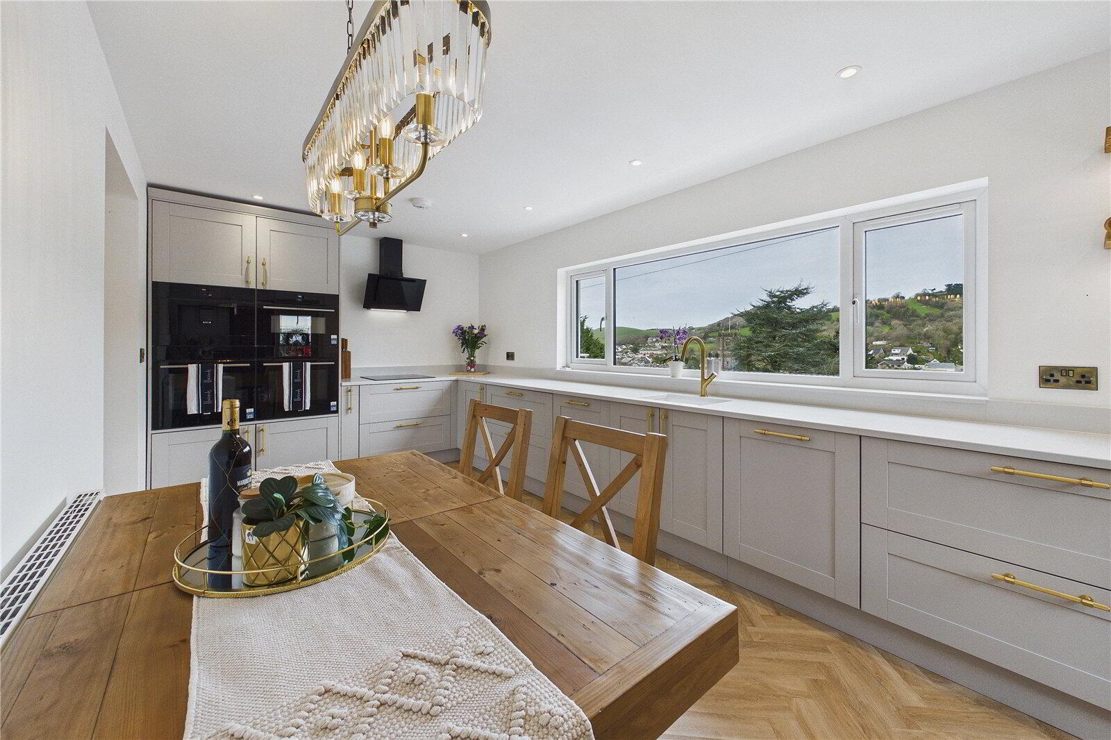 At the heart of the home is an impressive open-plan kitchen and dining space, finished to an exceptional standard with elegant quartz work surfaces and a full suite of high-end integrated appliances, including oven, microwave, dishwasher and coffee machine. This is a space designed for both everyday living and entertaining, enhanced by stylish herringbone flooring that flows seamlessly through the principal areas of the home.