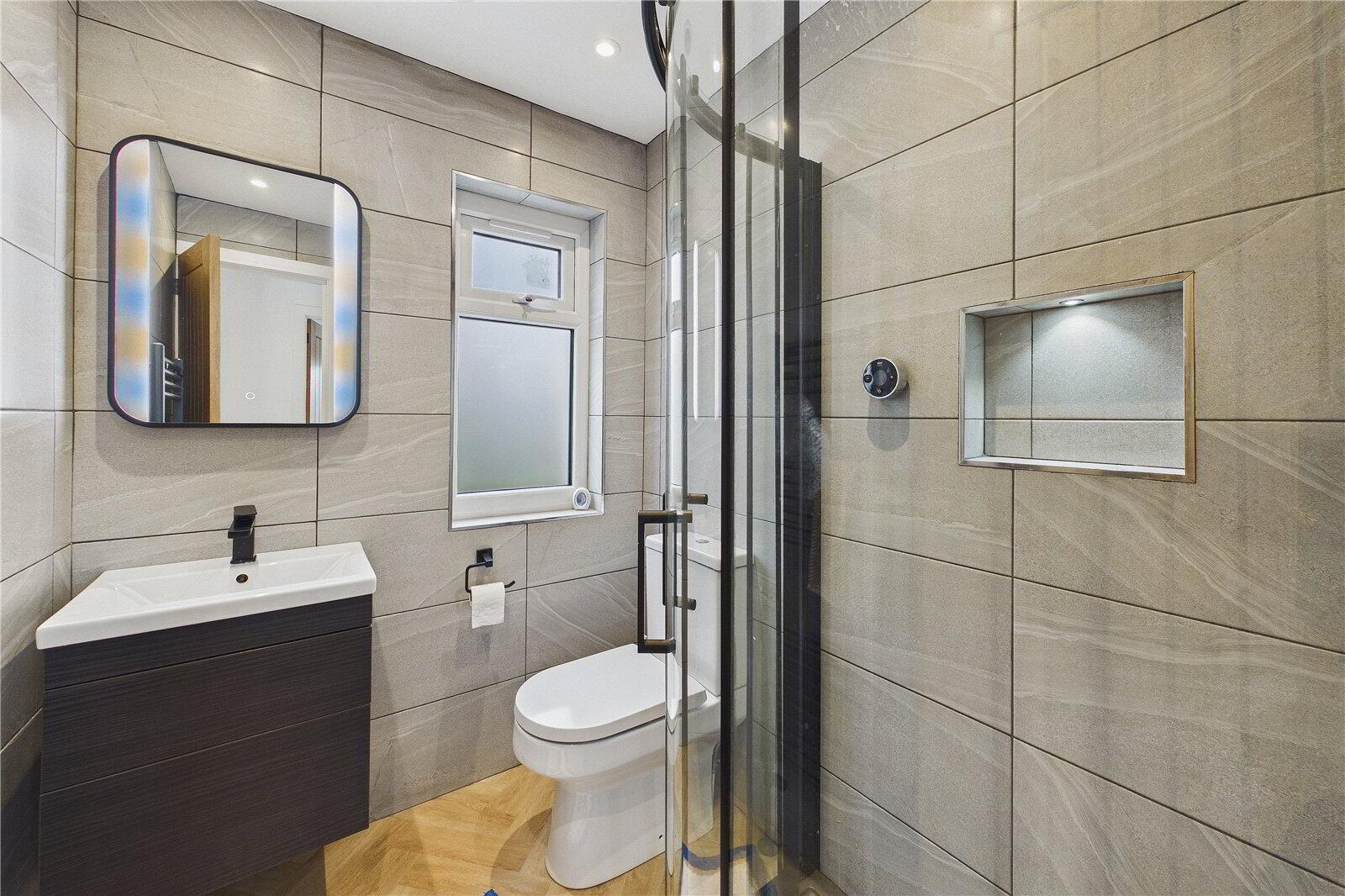 UPVC double-glazed window to rear elevation, herringbone wooden-effect flooring, double shower cubicle with Mira smart shower and rainfall shower attachment above, tiled walls, extractor fan, low-level flush button WC, wall-mounted wash hand basin with storage unit below and light-up vanity mirror above, heated towel radiator, spotlights. - Garages