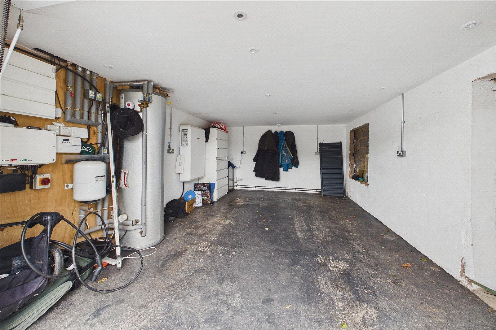 - Solar battery, water tank, fuse board locations, Baxi combi boiler, electric roll doors, plumbing.
