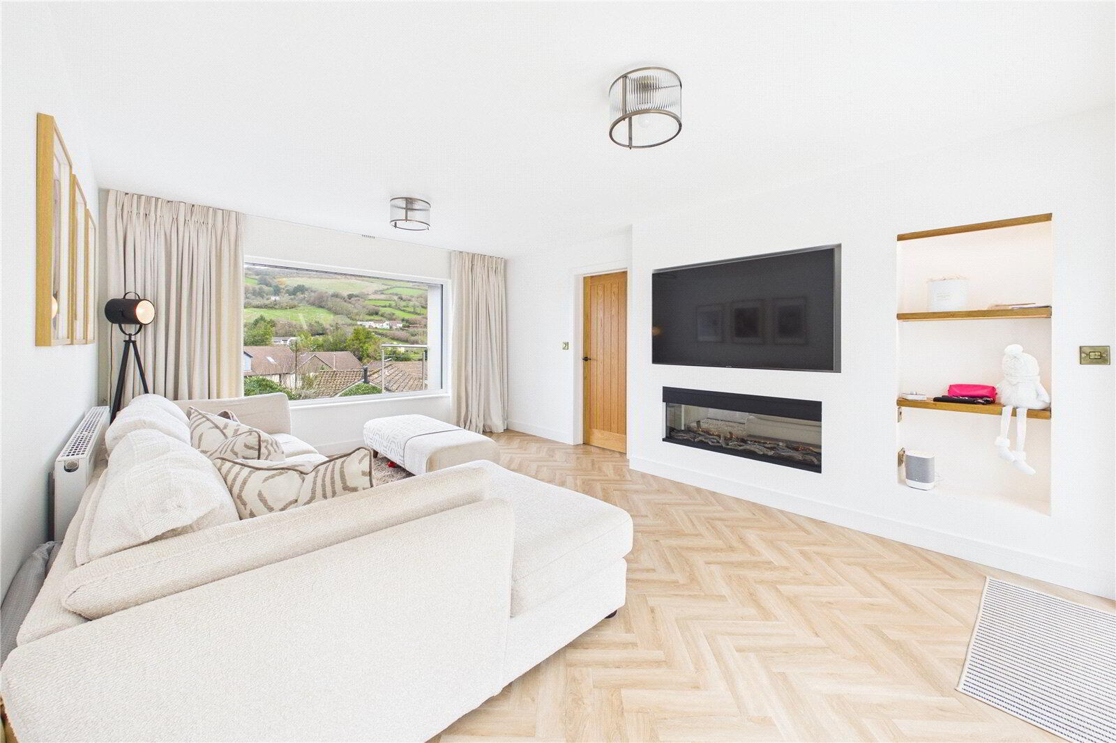 UPVC double-glazed window to front elevation with beautiful countryside views, herringbone wooden-effect flooring, UPVC double-glazed bi-fold doors to rear elevation leading to patio, media wall, electric fireplace, shelving with lighting, door leading to entrance hallway, opening leading to: - Hallway