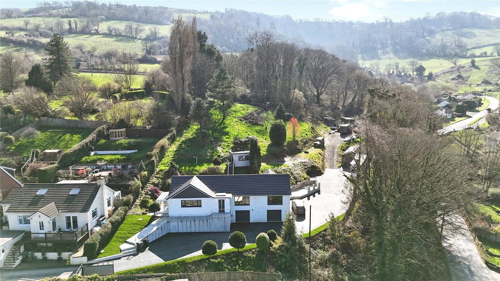 Approached via gated access, the property enjoys a high degree of privacy and a true sense of arrival. The grounds extend to approximately one acre and have been thoughtfully arranged to create a peaceful and secluded environment. The gardens gently slope and are partially tiered, combining expansive lawned areas with mature planting and natural screening, ensuring the property is not overlooked and providing a true sense of tranquillity. From various points, there are attractive outlooks across the surrounding countryside and towards the local church, further enhancing the setting.