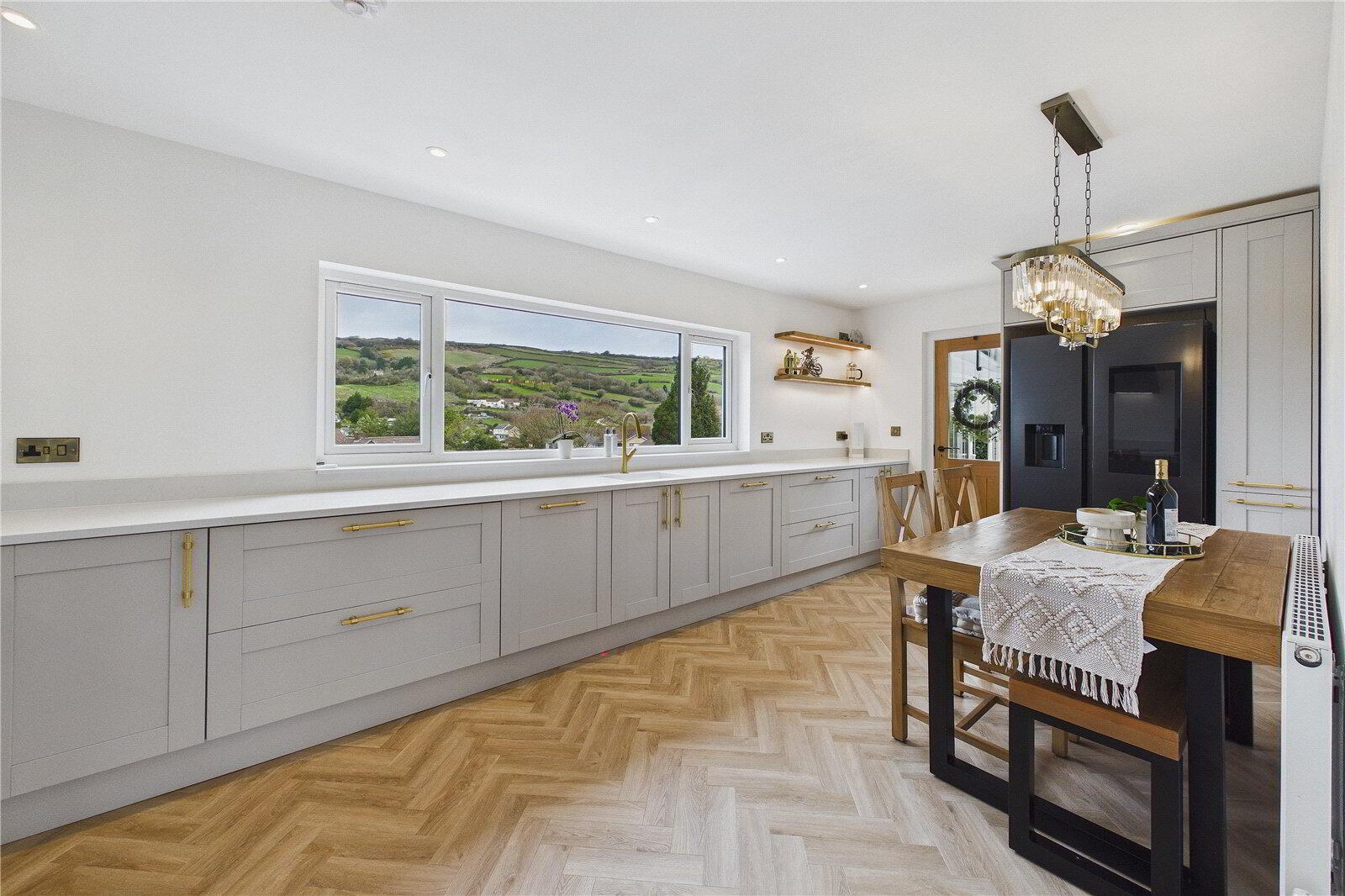 UPVC double-glazed window to front elevation with views towards the church and countryside, marble countertops, wooden cabinets with brass handles, integrated dishwasher, integrated oven, microwave and coffee machine, Bosch 4-ring induction hob with extractor fan above, soft-close drawers, herringbone wooden-effect flooring, radiator, space for fridge freezer, door leading to: - Conservatory