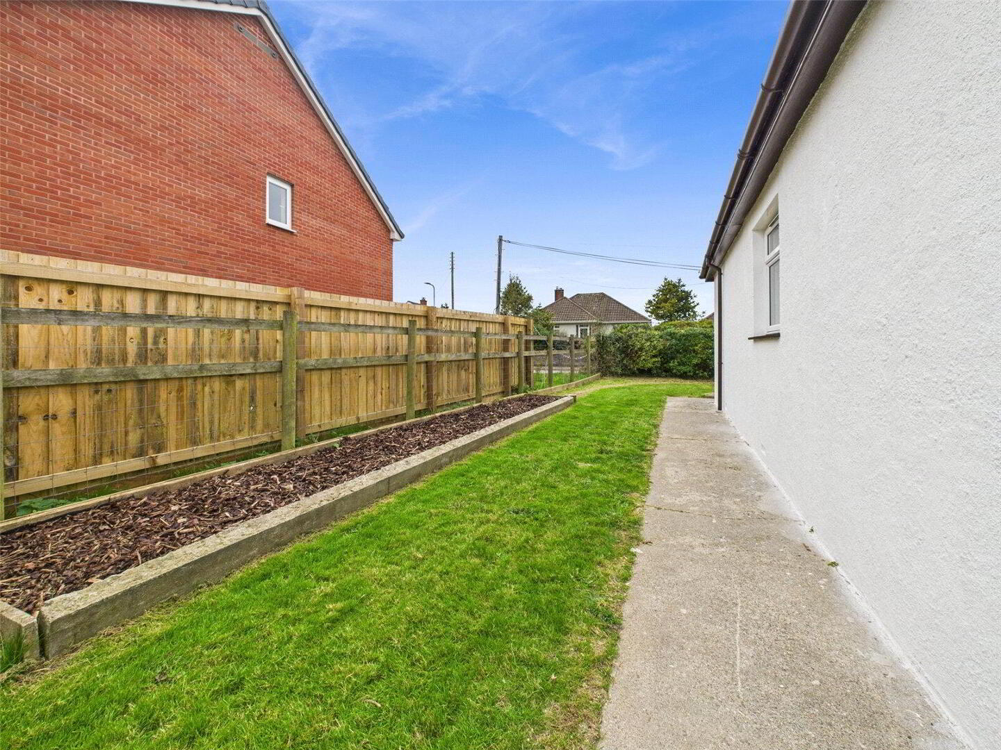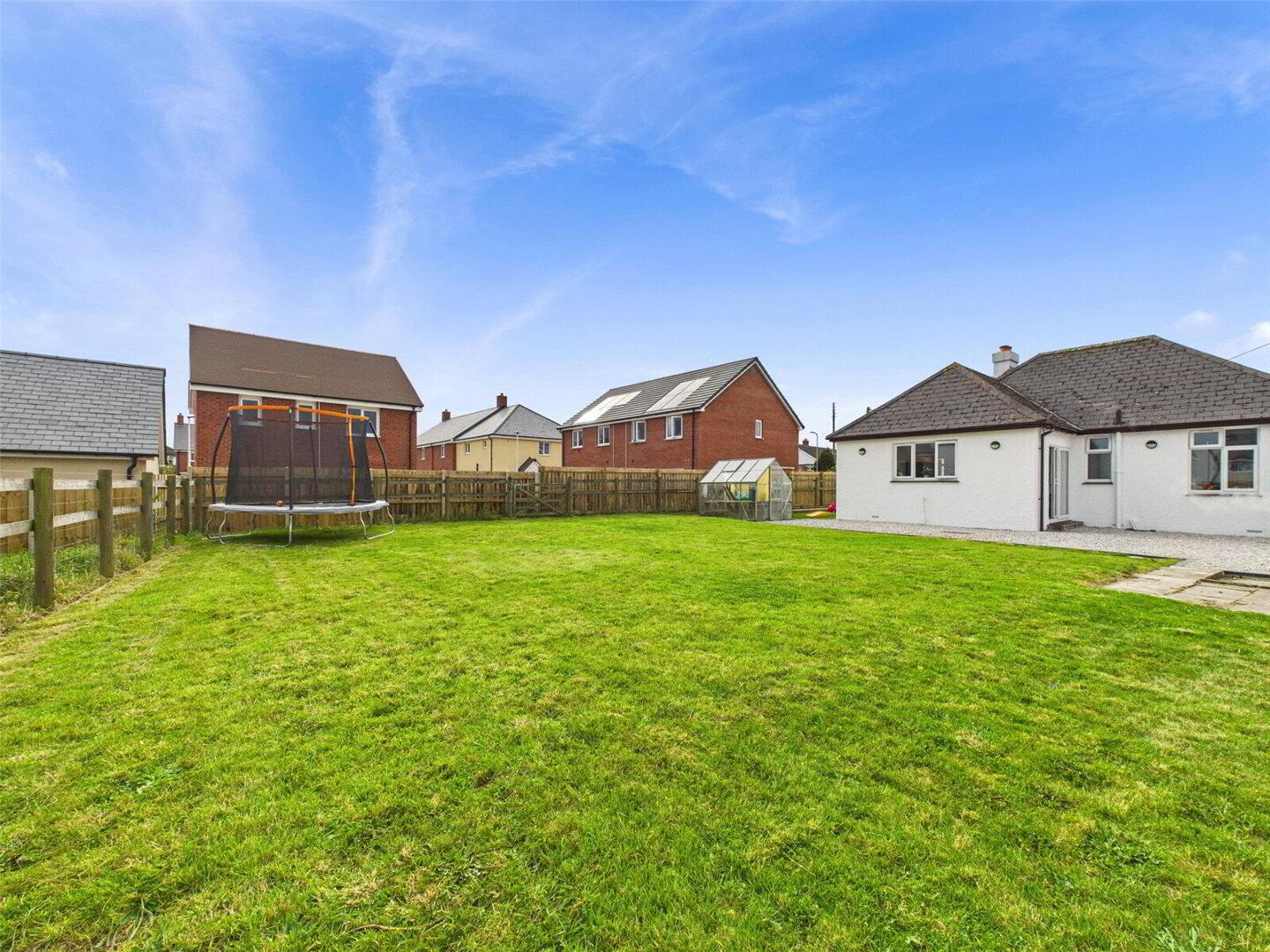 The rear garden is fully enclosed and primarily laid to lawn, offering a safe space for families or pets. A gravelled patio area just outside the kitchen doors is perfect for alfresco dining, with wraparound access leading to a greenhouse and raised beds – ideal for those with green fingers.